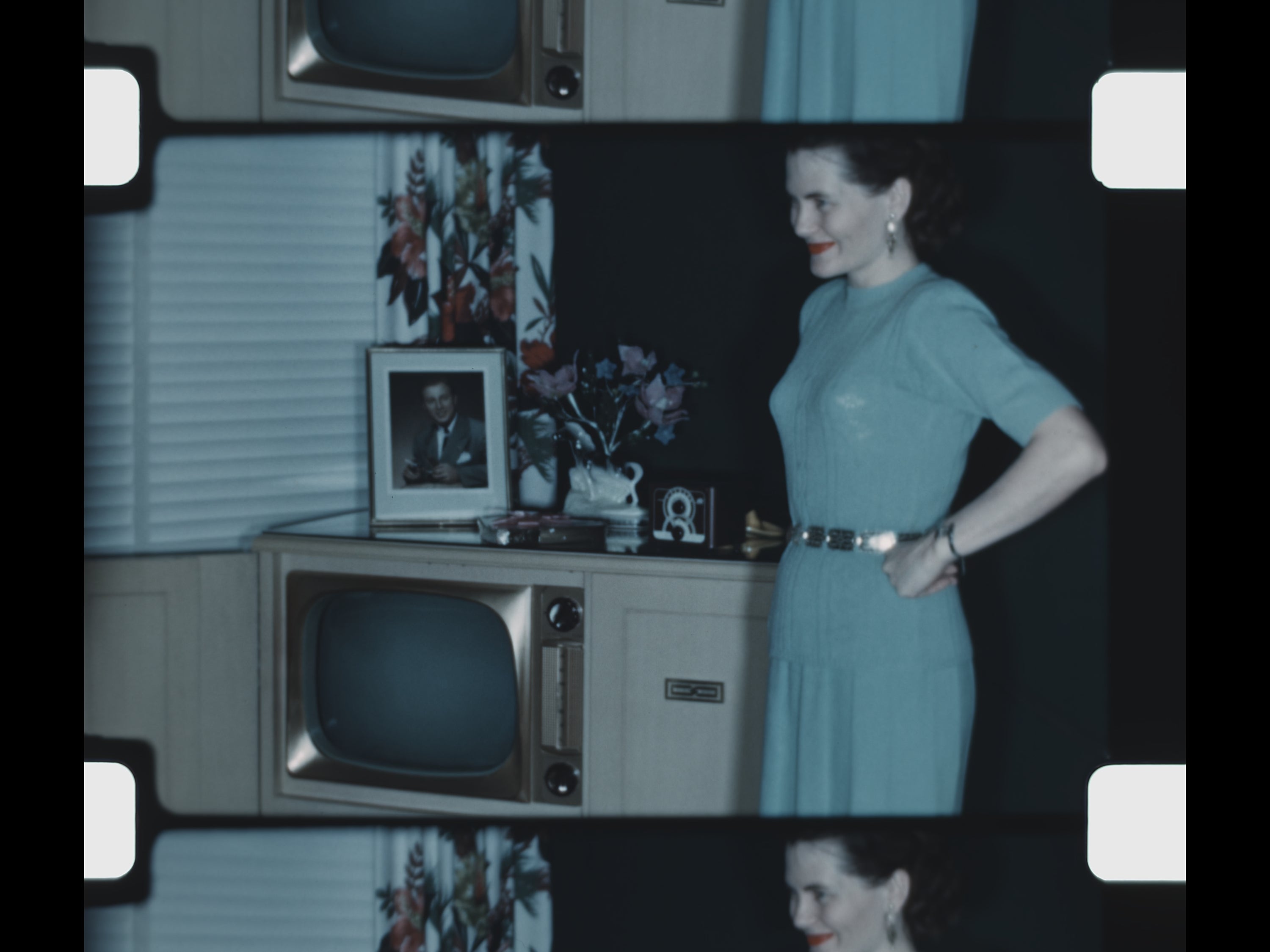 Together, these images preserve a gentle, seasonal portrait of family life—moving from winter neighborhoods and backyard chores to travel, beach outings, and shared celebration—captured through candid midcentury home moviemaking.