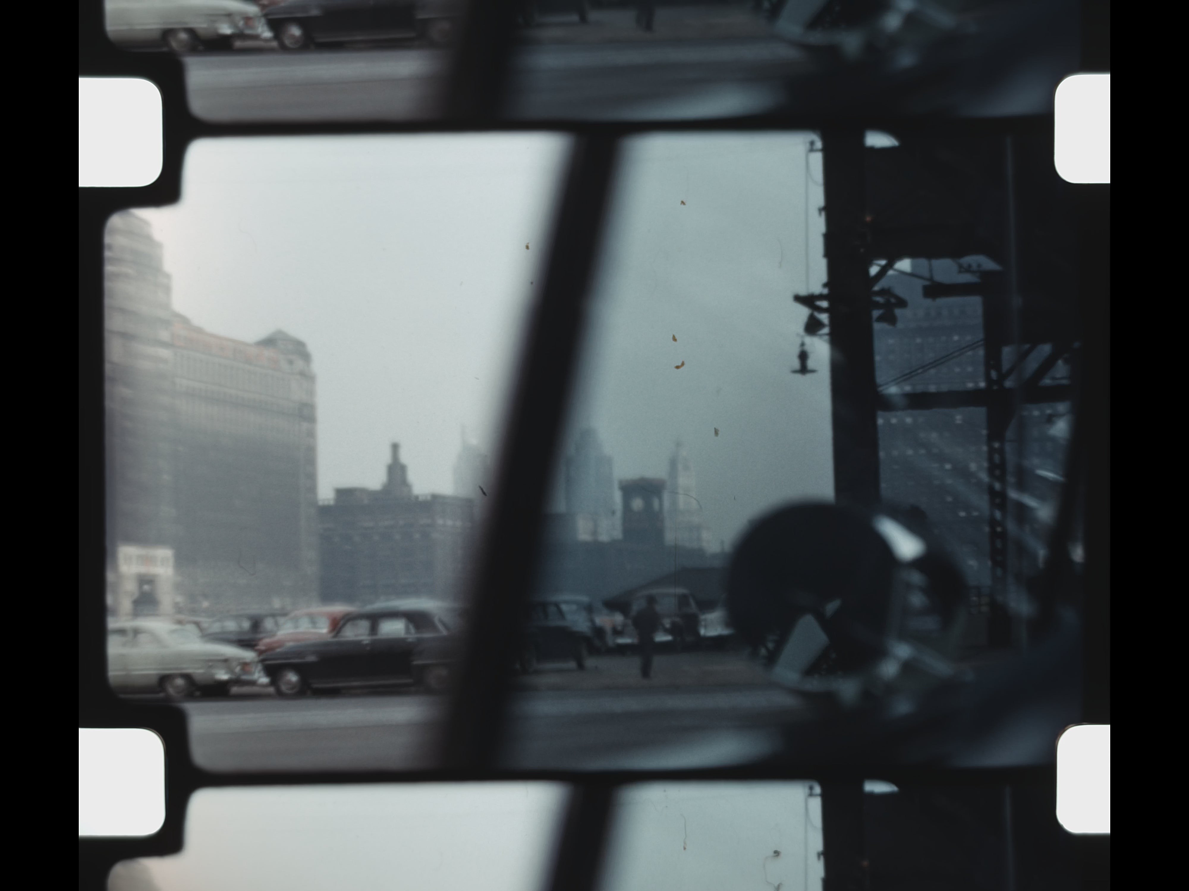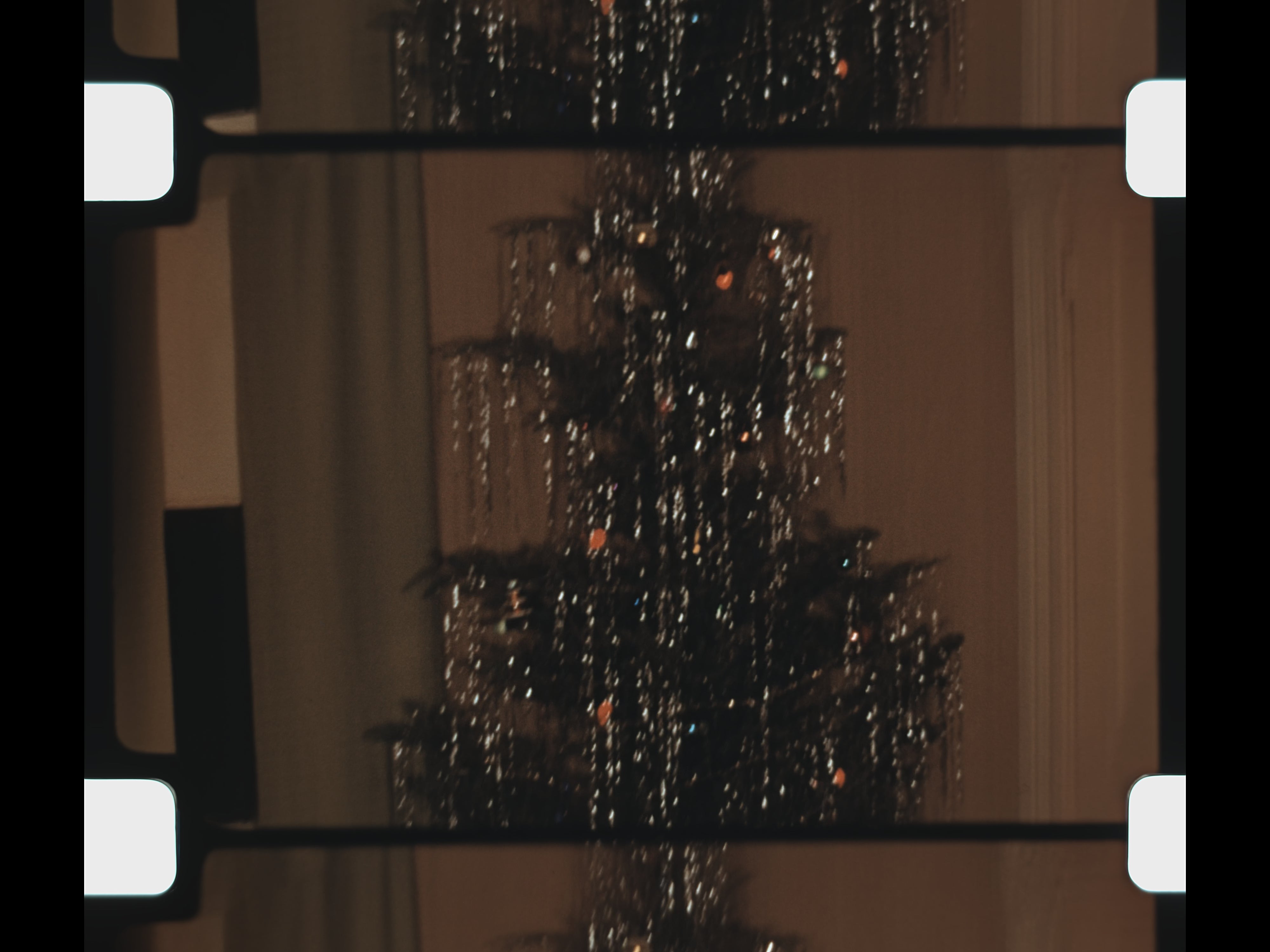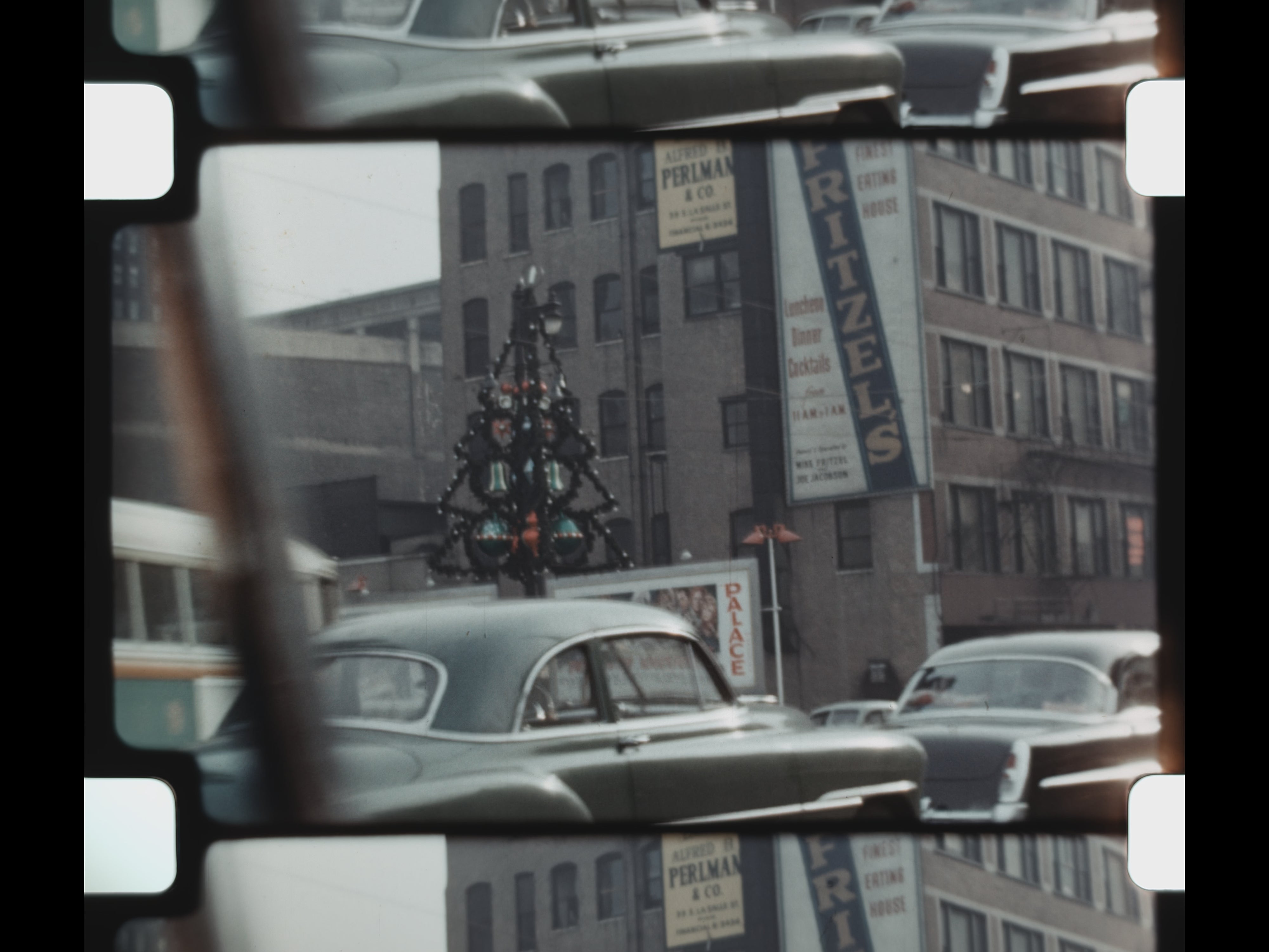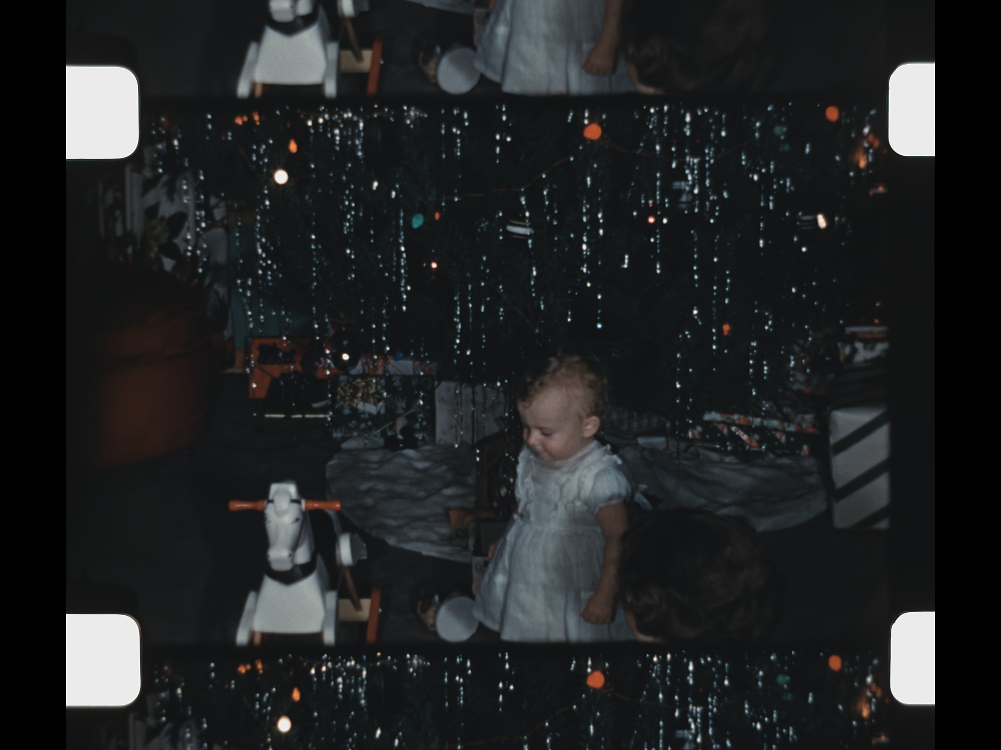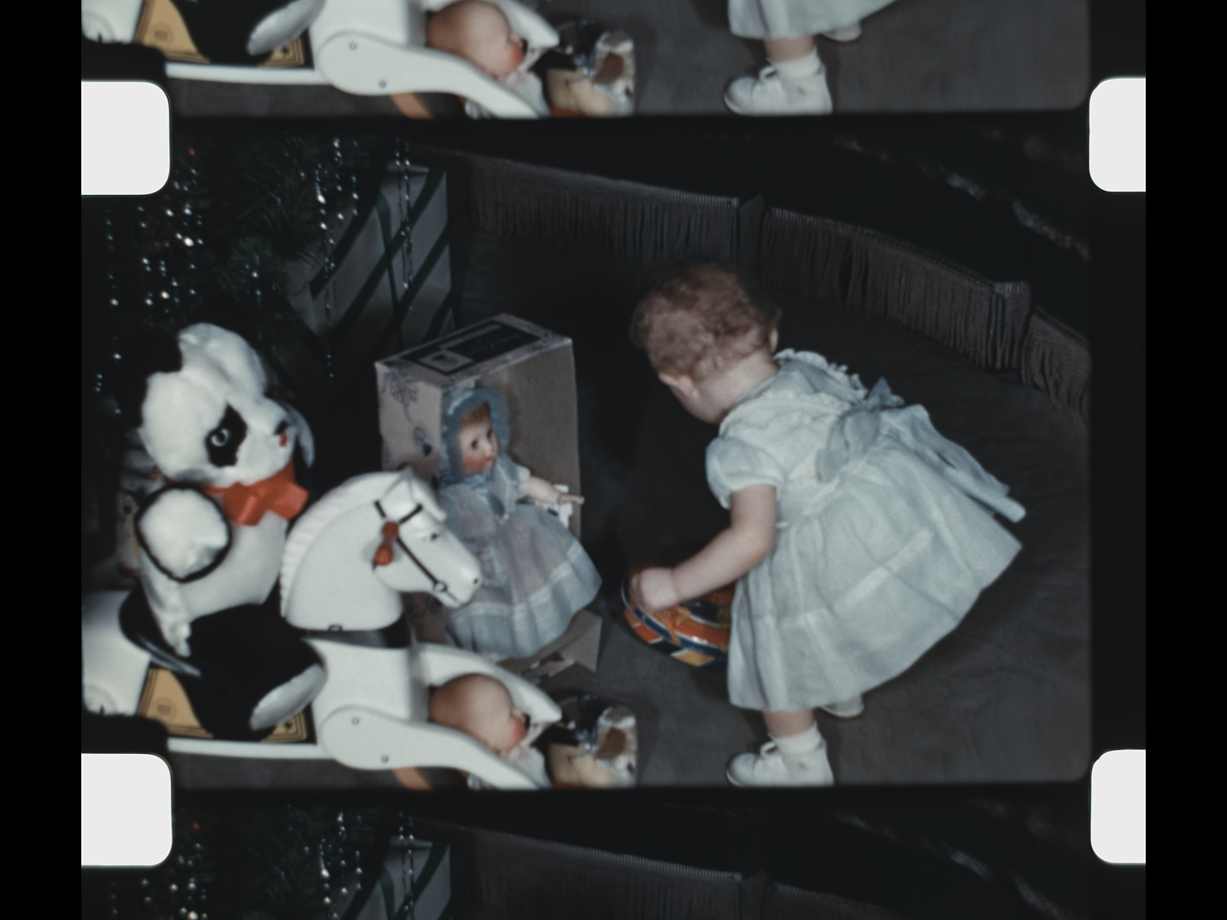 Christmas appears prominently in the second half of the reel. Street scenes filmed from inside a car show city decorations and lights during the holiday season. Inside the home, a decorated Christmas tree stands surrounded by festive décor. A young girl opens presents beneath the tree, while additional shots linger on the home’s Christmas decorations, preserving a detailed record of holiday traditions in 1952.