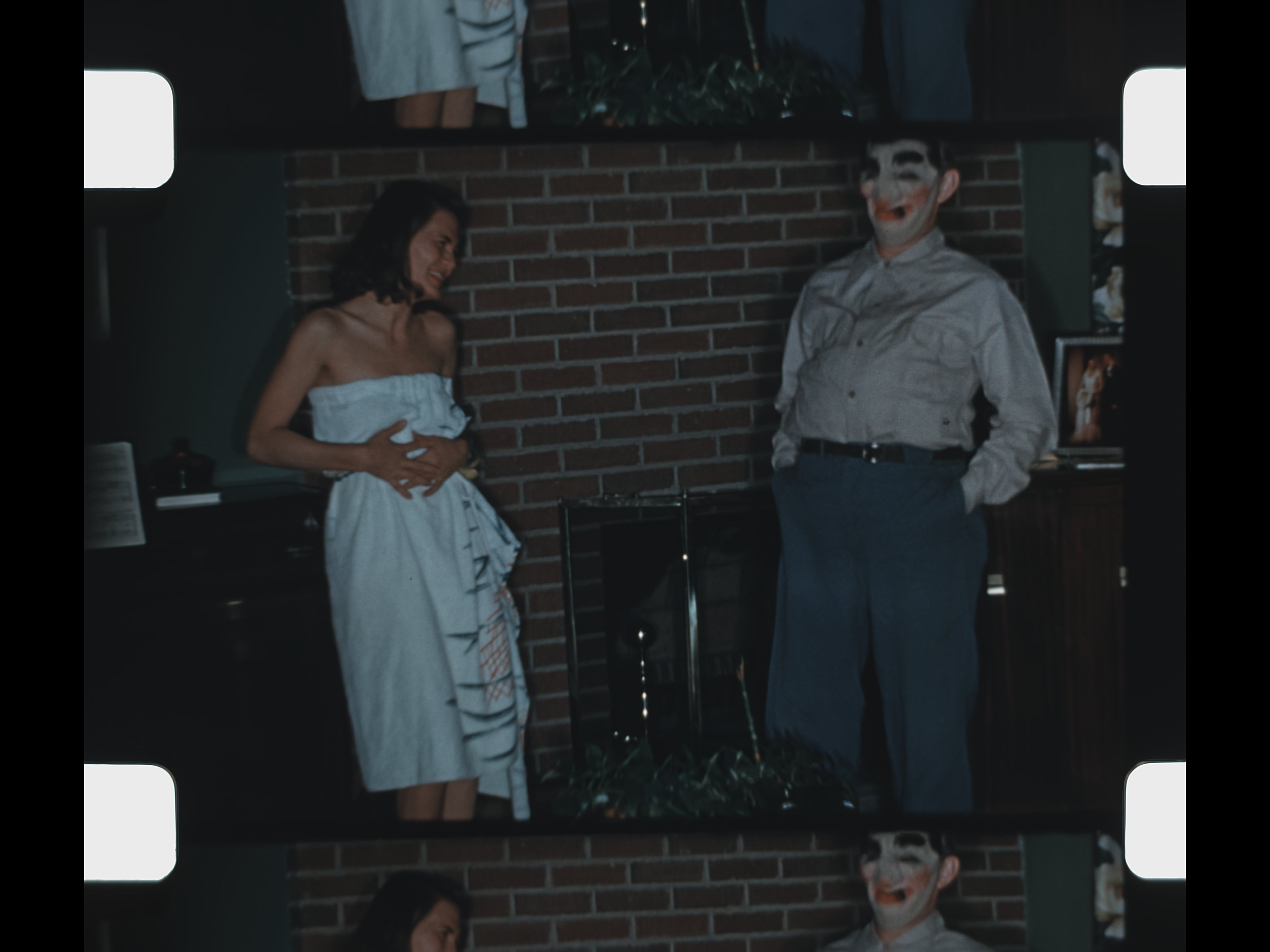 1952, Home movies, 16mm film, Black and white film, Silent film, Family life, Children playing, Outdoor family scenes, Smoking adults, Birthday cake, Blowing out candles, Costumes, Halloween, Piano, Mother and baby, Christmas, Christmas tree, Opening presents, Holiday decorations, City Christmas lights, Shooting hoops, Basketball, Firearms, Father and son, New Year’s Eve, Party, Dancing, Postwar America, Americana, Analog film, Nostalgic footage, Archival home movie