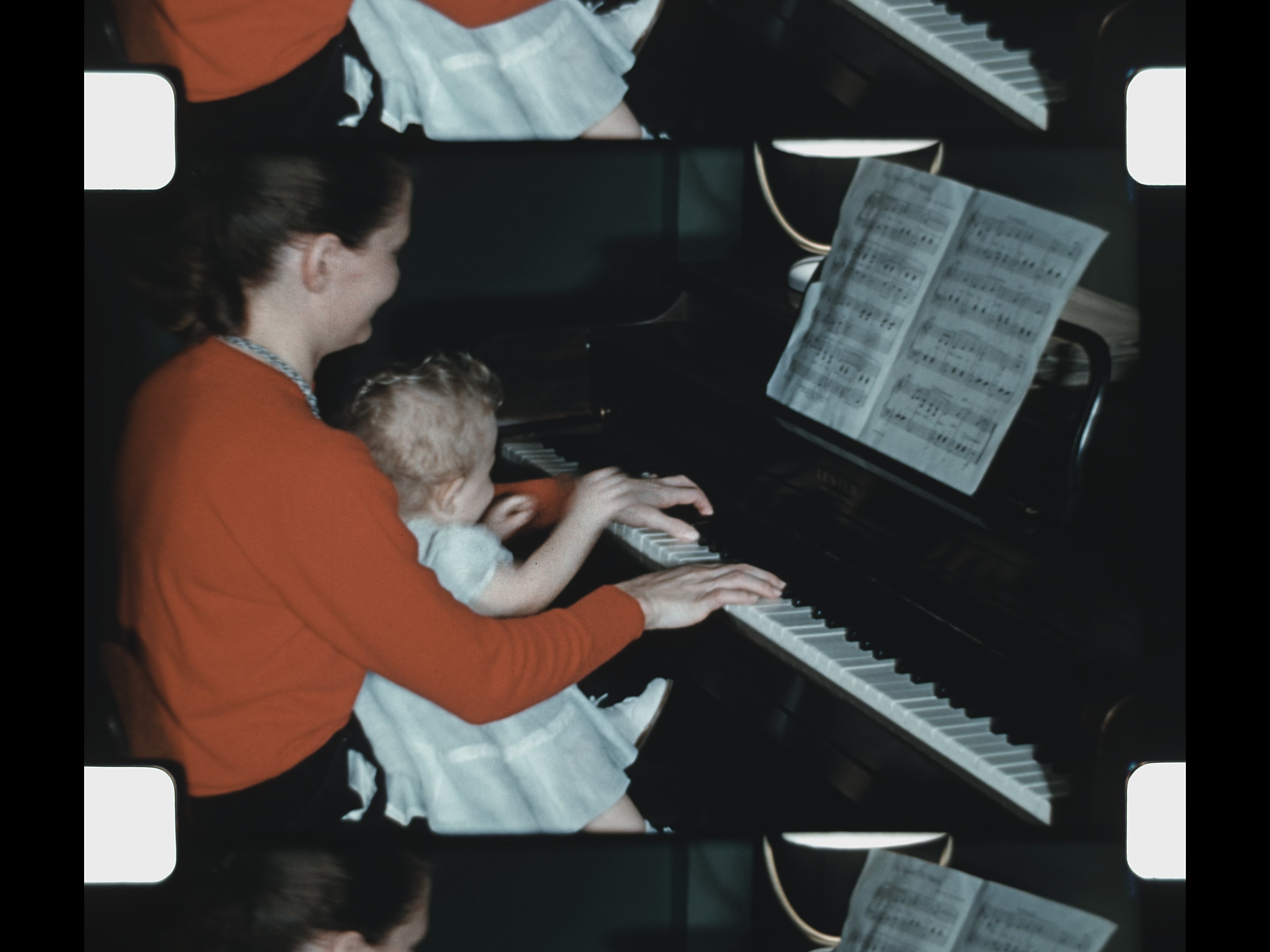 Costumed scenes follow, possibly tied to Halloween festivities, before the film transitions to quieter, intimate moments. A mother and baby sit together at a piano, gently playing—one of the reel’s most tender domestic sequences.