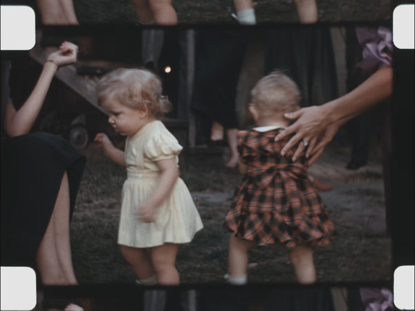 The reel opens with scenes of the family spending time together outdoors. Children play in yards and open spaces while adults stand nearby talking and smoking—casual social moments that reflect the rhythms of everyday life in the early 1950s. The setting shifts indoors to a gathering around a dinner table, where a cake takes center stage. A man blows out candles, suggesting a birthday or family milestone.