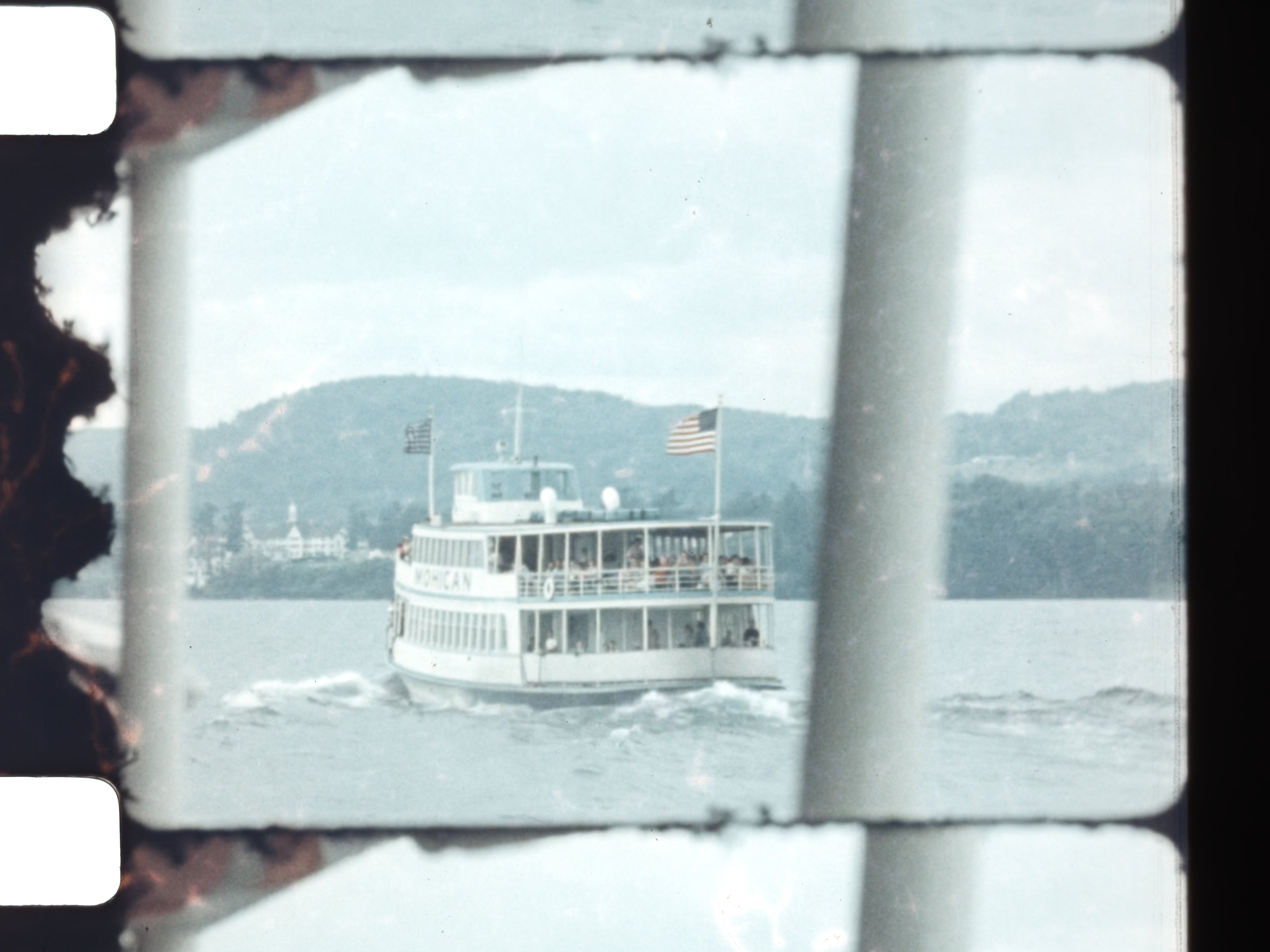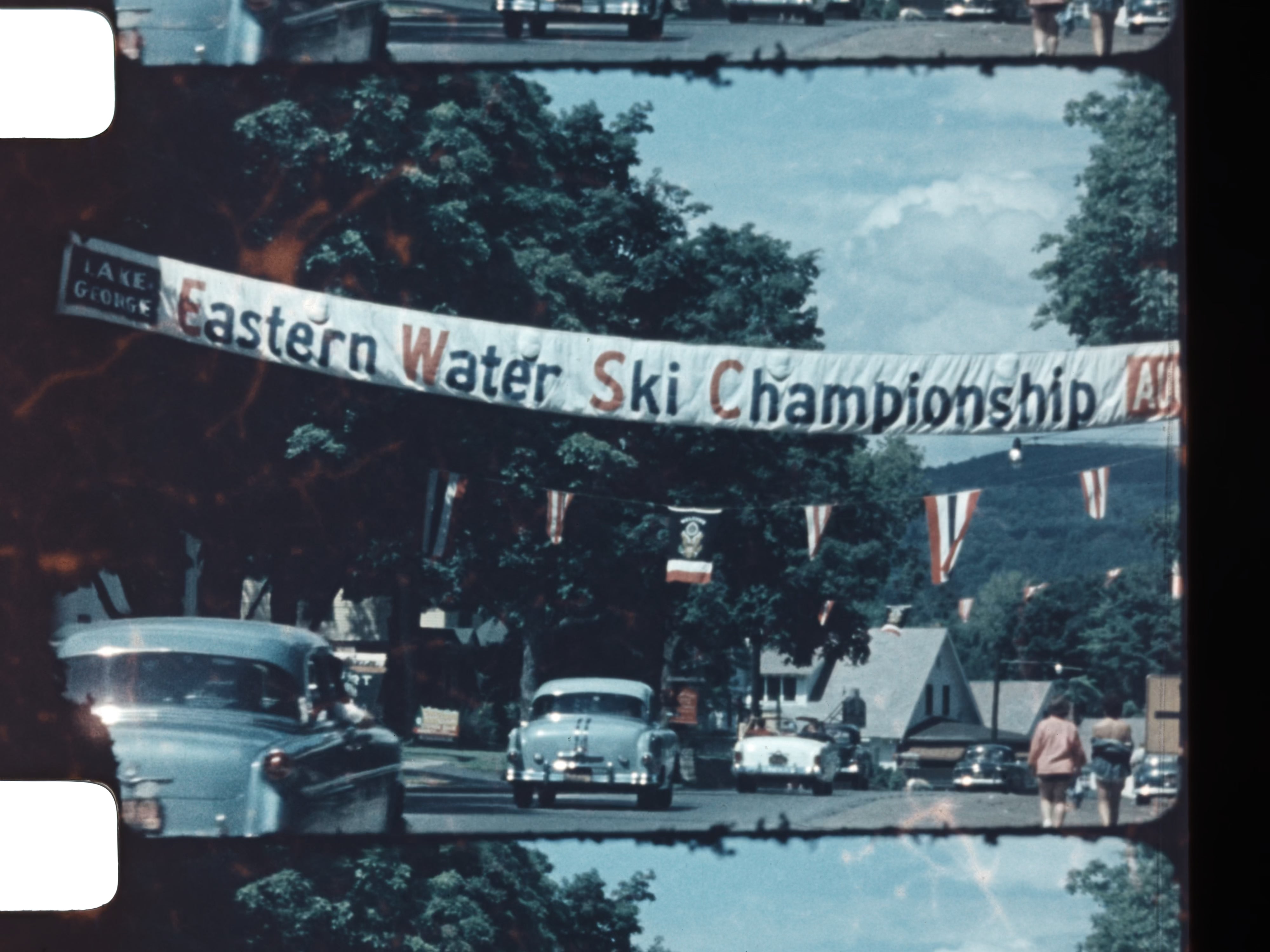 Lake George, New York, Adirondacks, Upstate New York, Summer vacation, Lakeside tourism, 16mm film, Color home movies, Boats, Boating, Steamboat, Lake George Steamboat Company, Ticonderoga, Water skiing, Eastern Water Ski Championship, Sports on water, Beach, Swimming, Lifeguard, Dock jumping, Cars, Busy streets, Town life, Neighborhoods, Local businesses, Fort William Henry, Scenic travel, Midcentury leisure, Vintage Americana, Analog film, Nostalgic footage