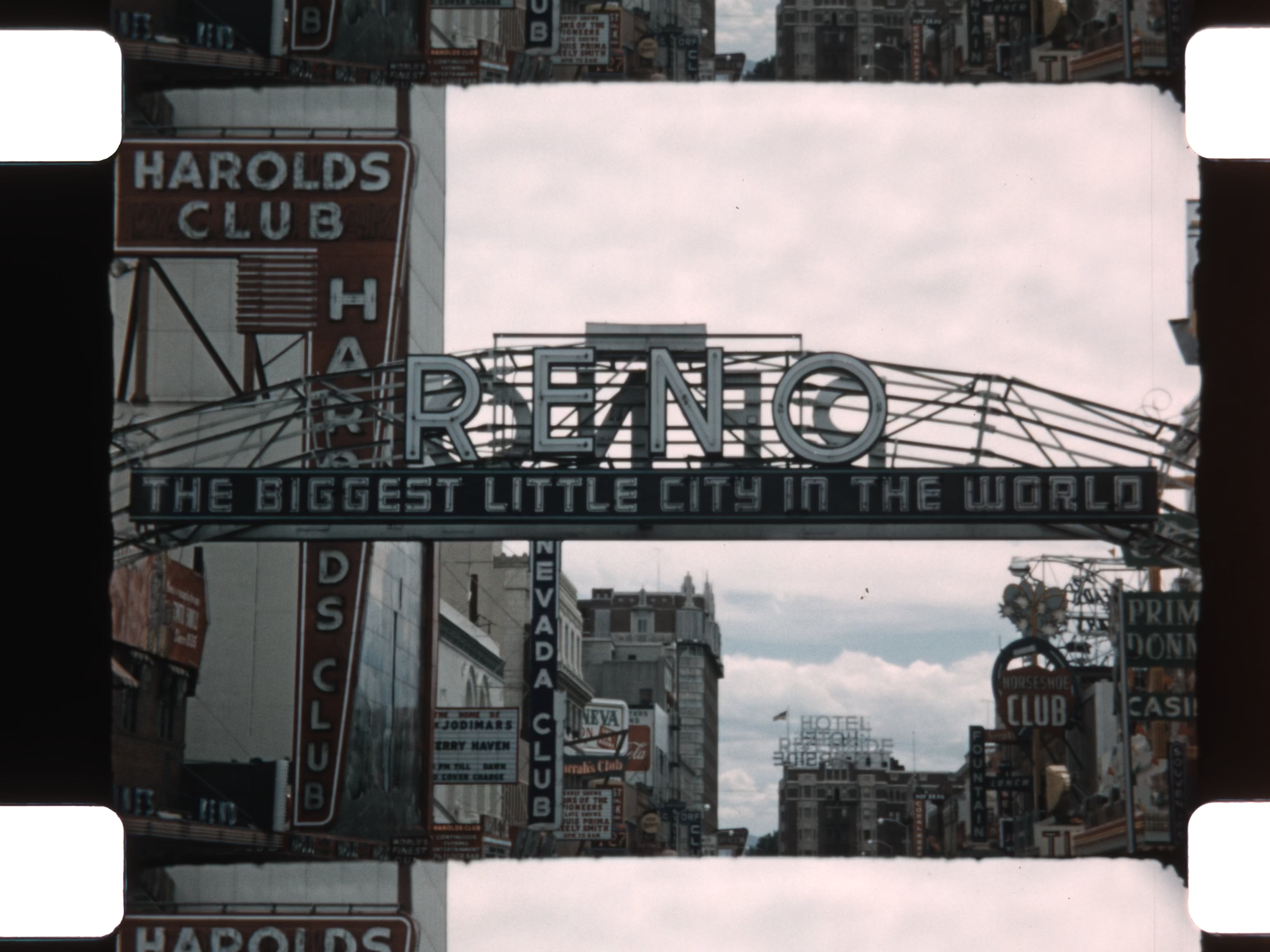 The film opens with cars driving along open highways bordered by mountains and pine forests. A roadside sign welcomes travelers to Reno, proudly billed as The Biggest Little City in the World. Outdoor recreation follows, with people hiking trails and picnicking amid foothills and sagebrush landscapes.