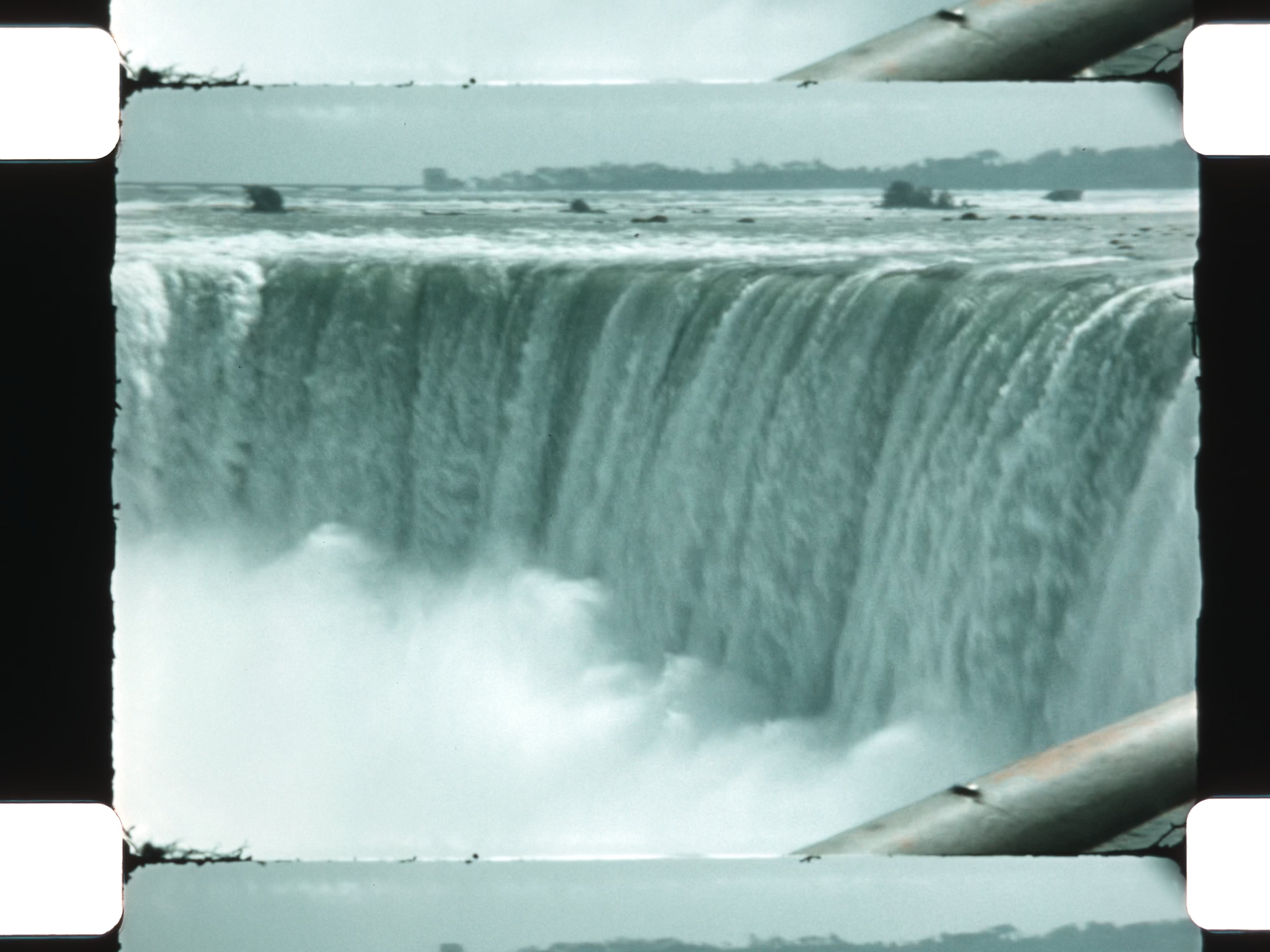 The reel concludes with iconic natural power and modern industry—mist rising from Niagara Falls and a sea barge released into open water—closing on images that reflect both America’s natural grandeur and its midcentury momentum.