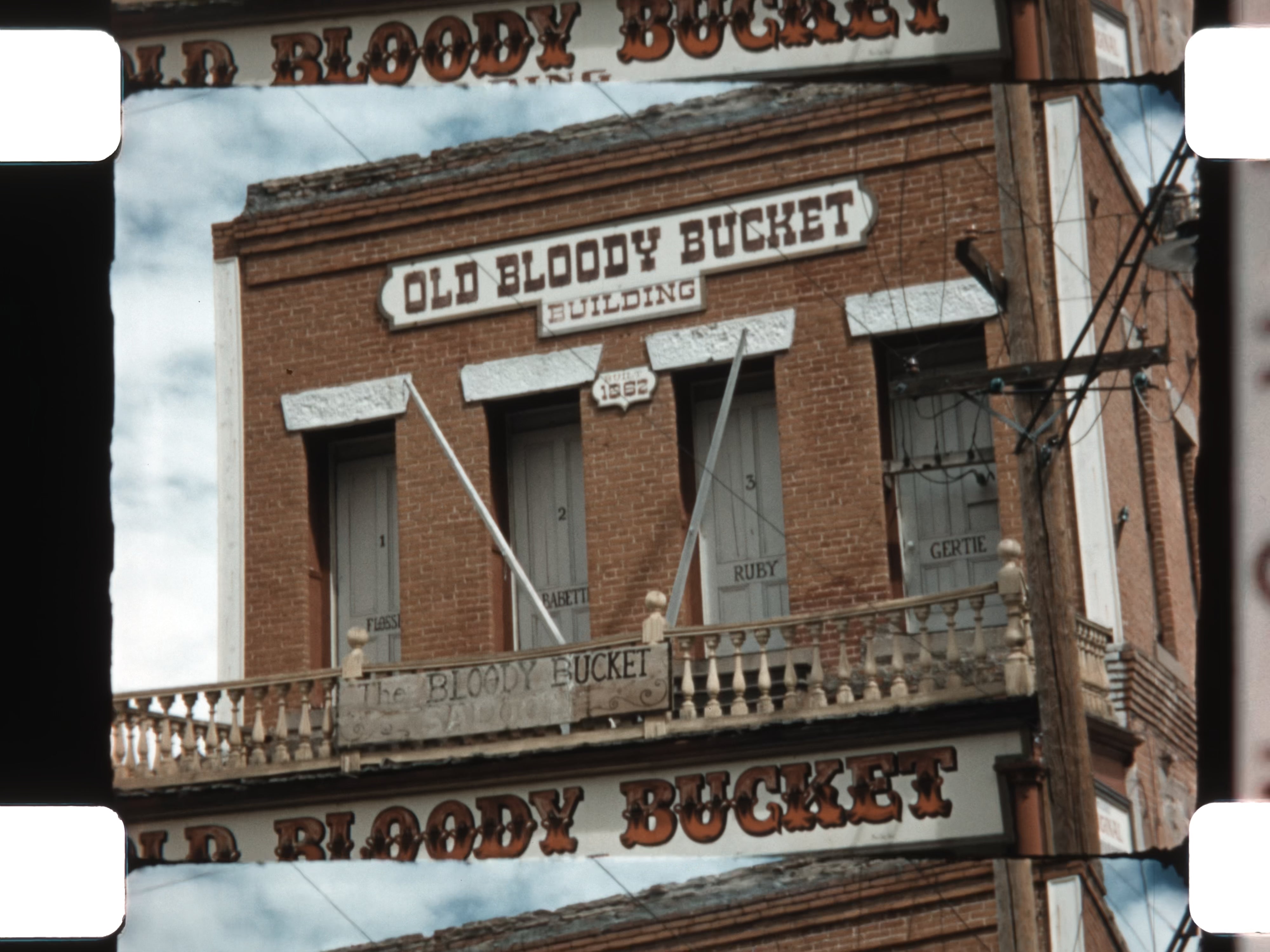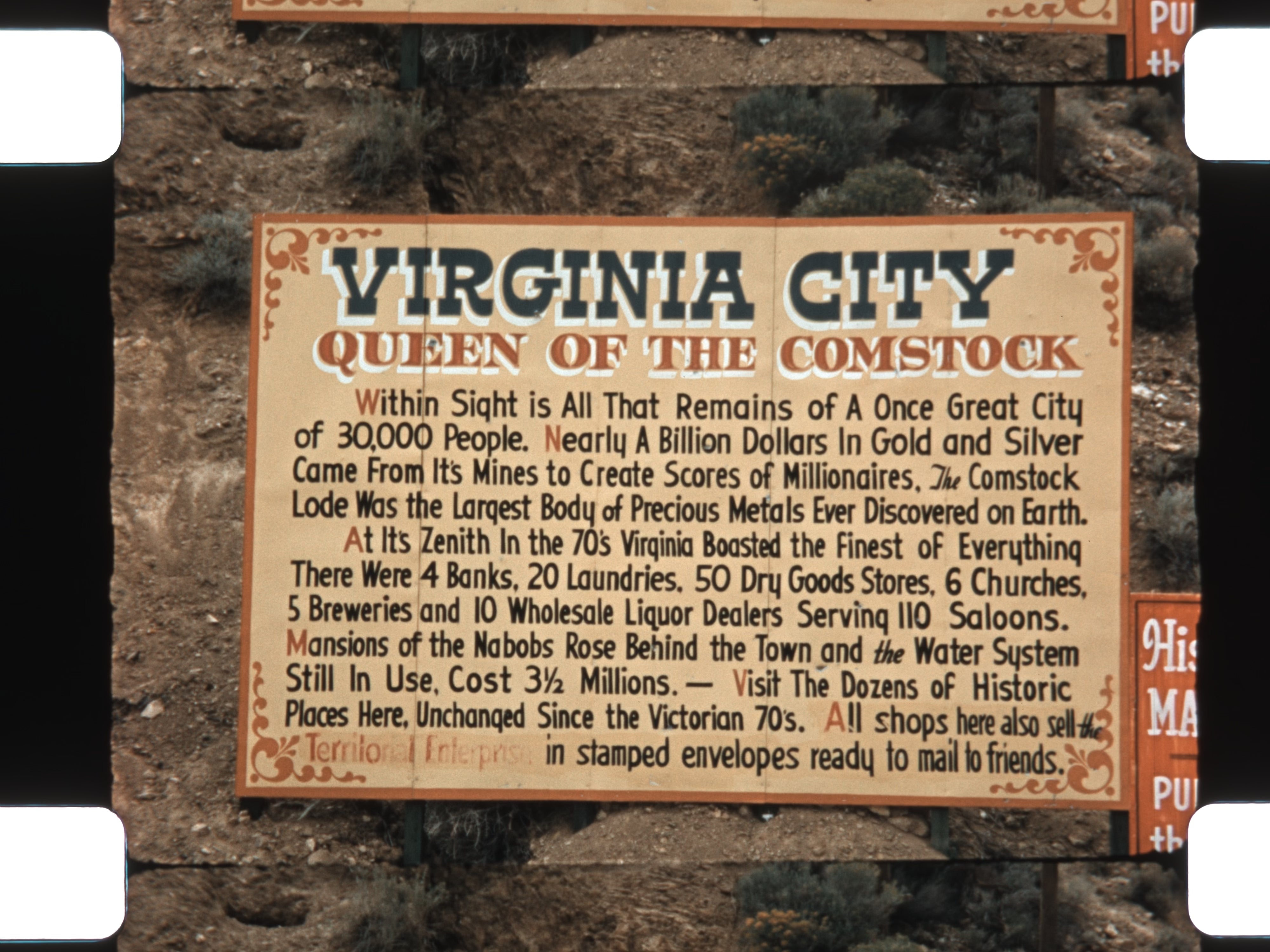 Historic mining towns feature prominently. Distant views introduce Virginia City, known as the Queen of the Comstock. The camera lingers on preserved buildings and storefronts, including the Old Bloody Bucket Building and The Brass Rail saloon, capturing the atmosphere of a once-booming gold and silver town. Nearby, large-scale mining operations and open pits appear against mountainous backdrops, highlighting the industrial legacy of the region.