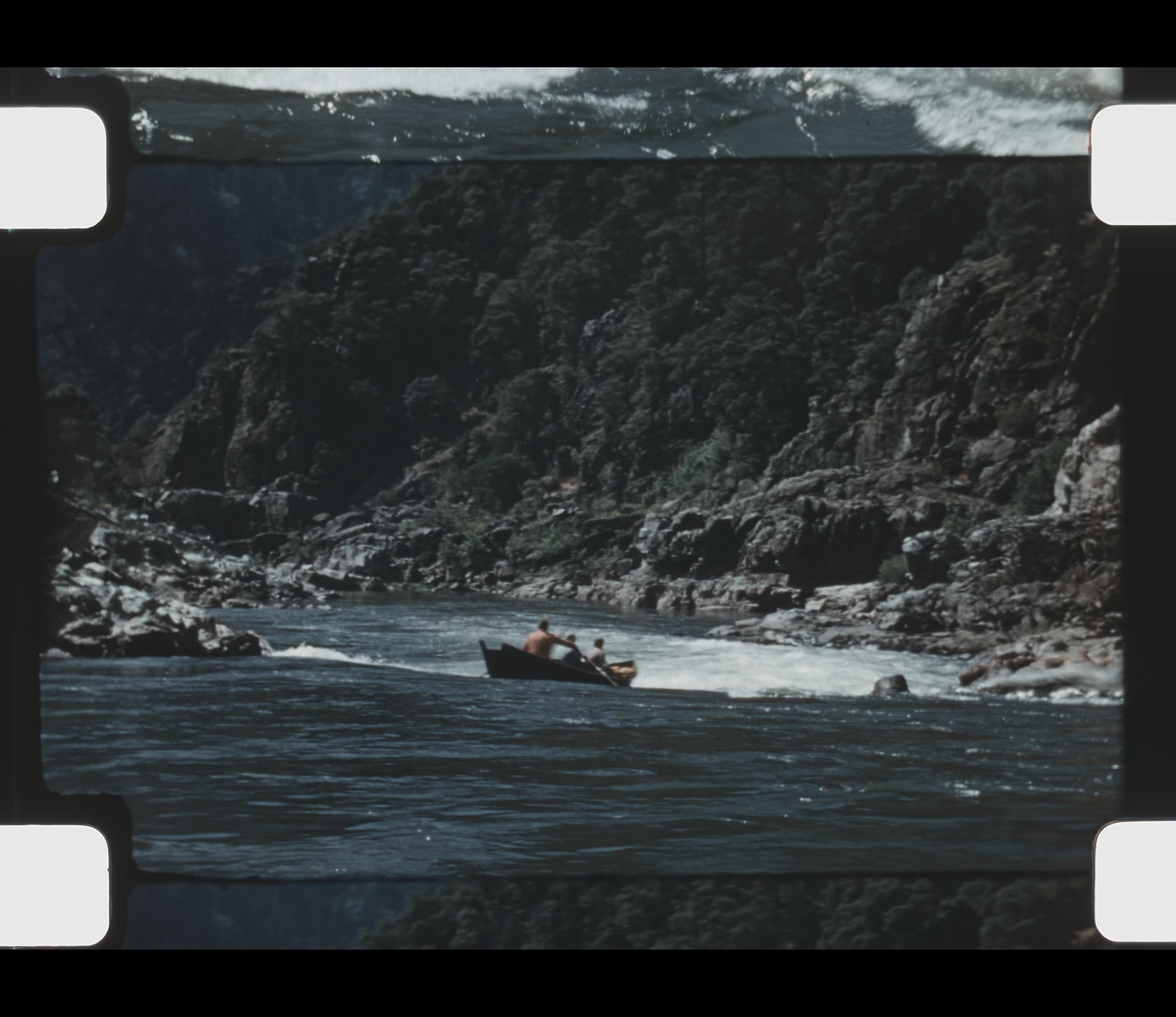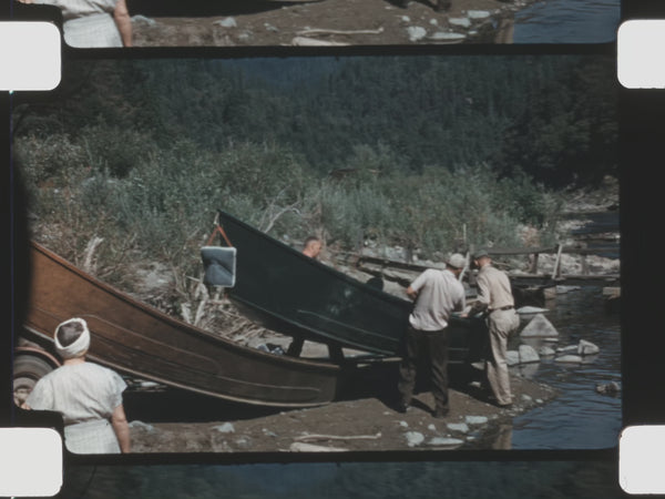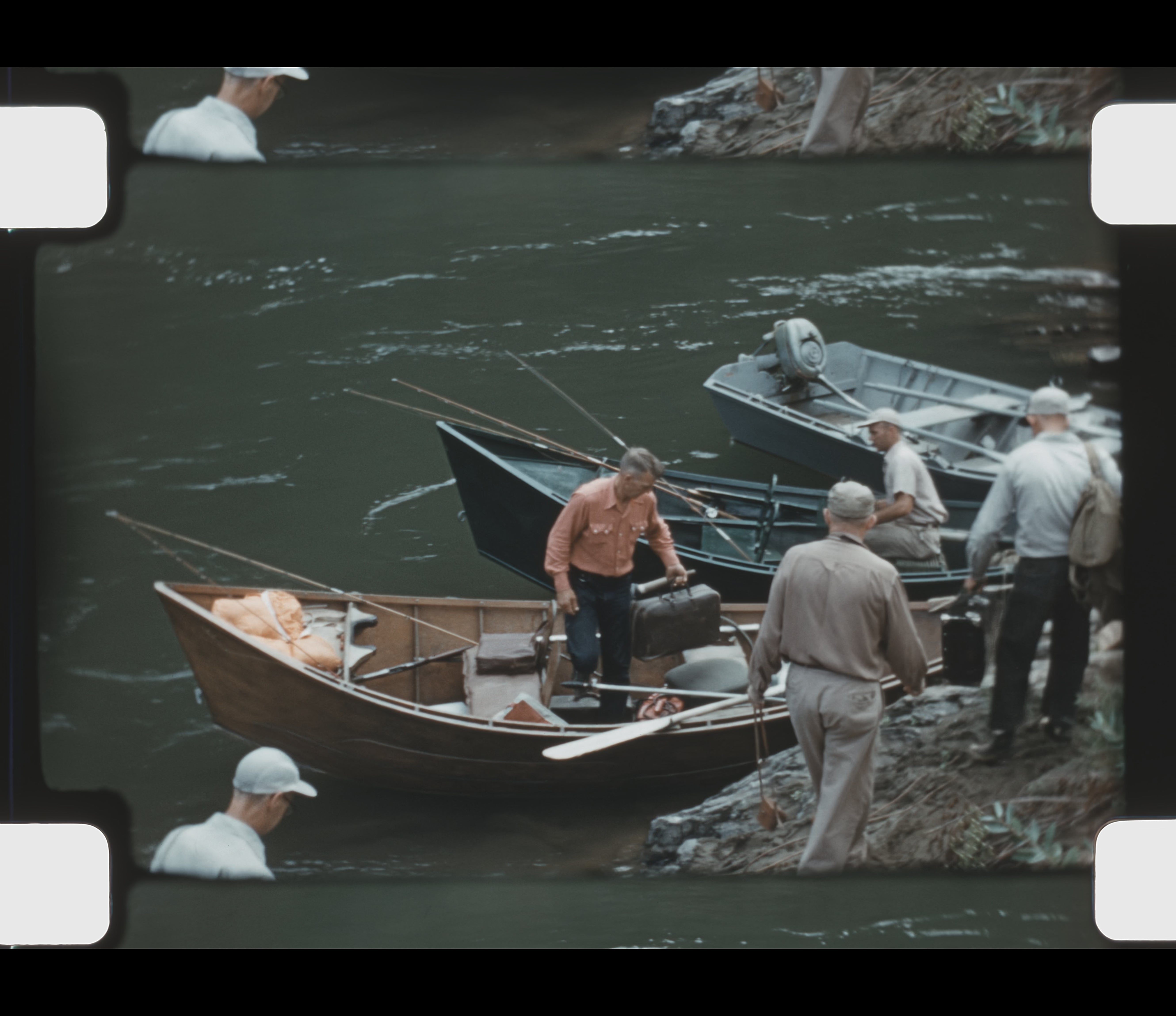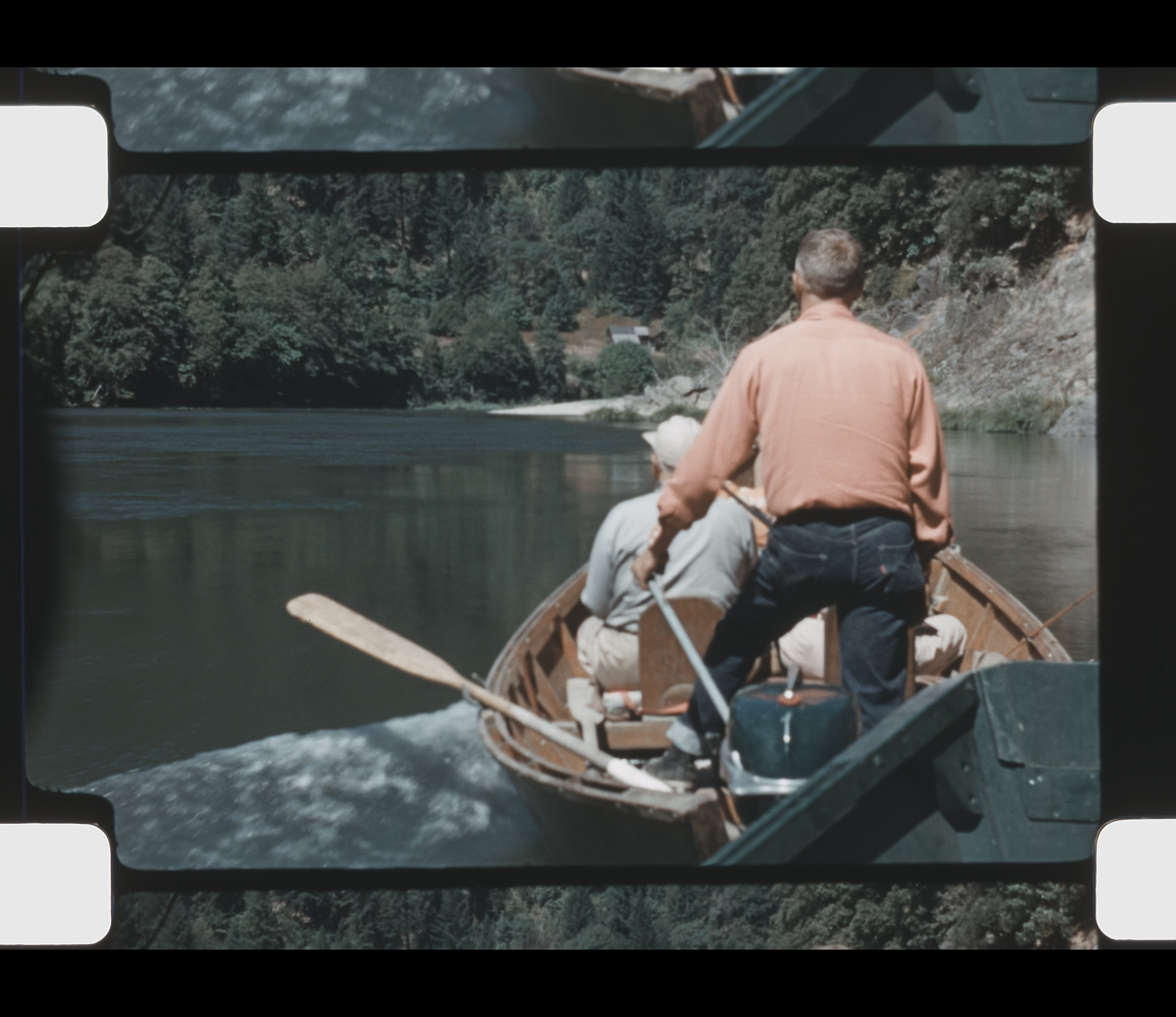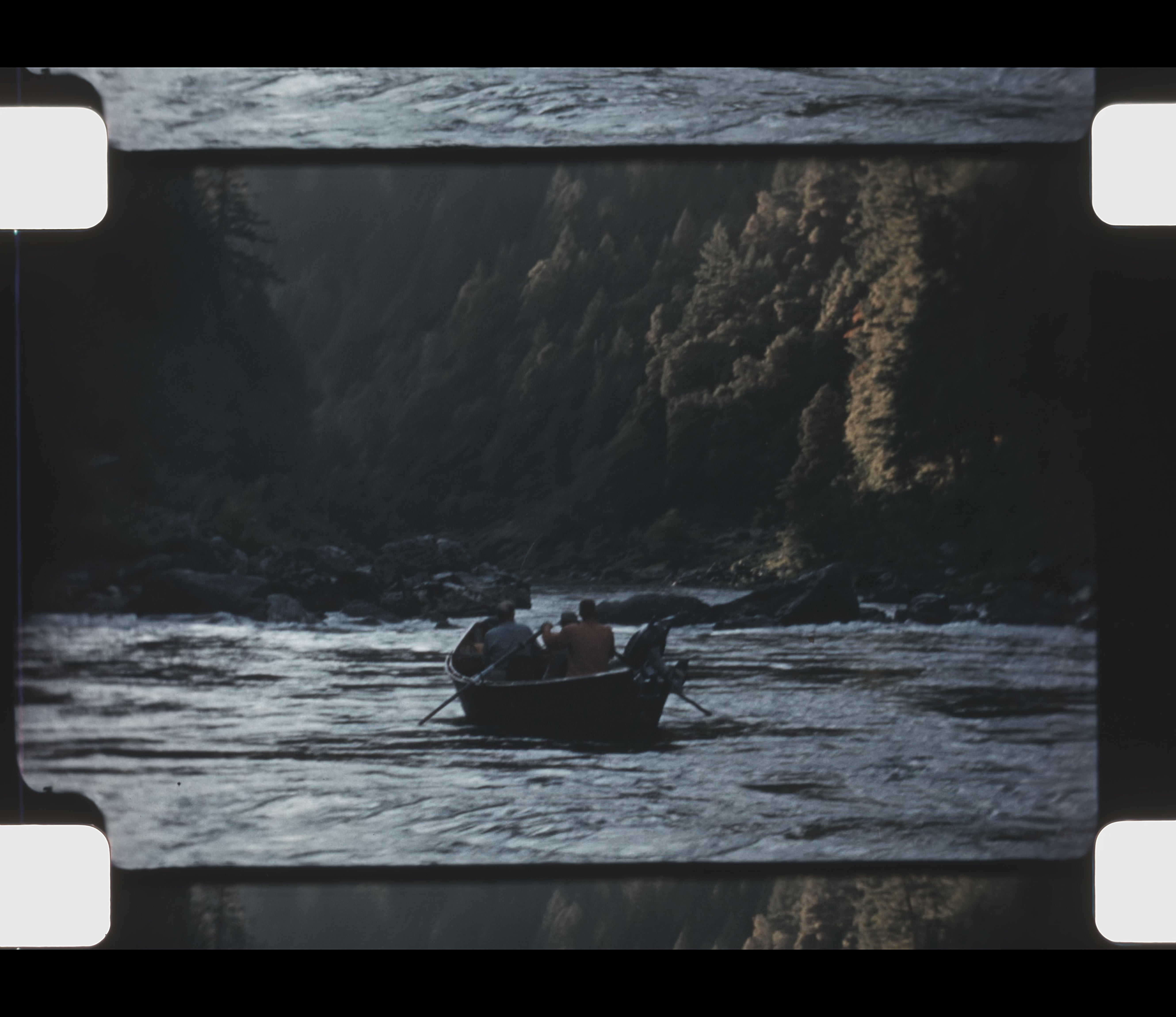 Oregon, Rogue River, Pacific Northwest, 16mm film, Black and white footage, Color home movies, Fishing trip, River fishing, Motorized boats, Boat launch, River rapids, Whitewater, Boating, Outdoor recreation, Men fishing, Catching fish, Cabin in forest, Log cabin, Abandoned homestead, Exploration, Wilderness travel, Midcentury America, Vintage outdoor life, Postwar leisure, Analog film, Nostalgic footage, Home movies