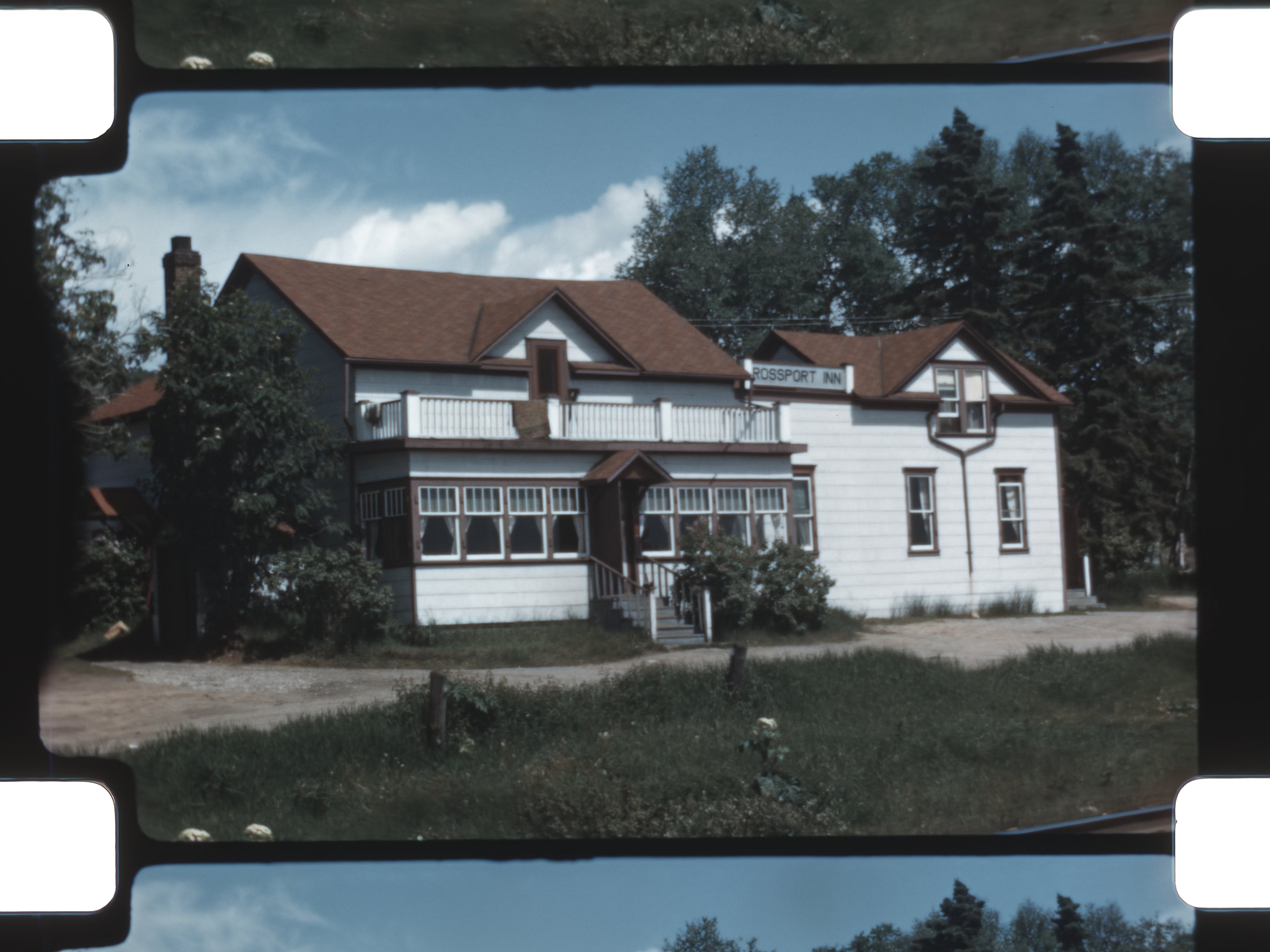 Additional vignettes include views of White Sand Lake Park, a dog wandering casually through camp or town settings, and exterior shots of the Crossport Inn. The reel closes on images of fluffy white clouds drifting across open sky—an unhurried ending to a journey defined by scenery, travel, and family exploration.