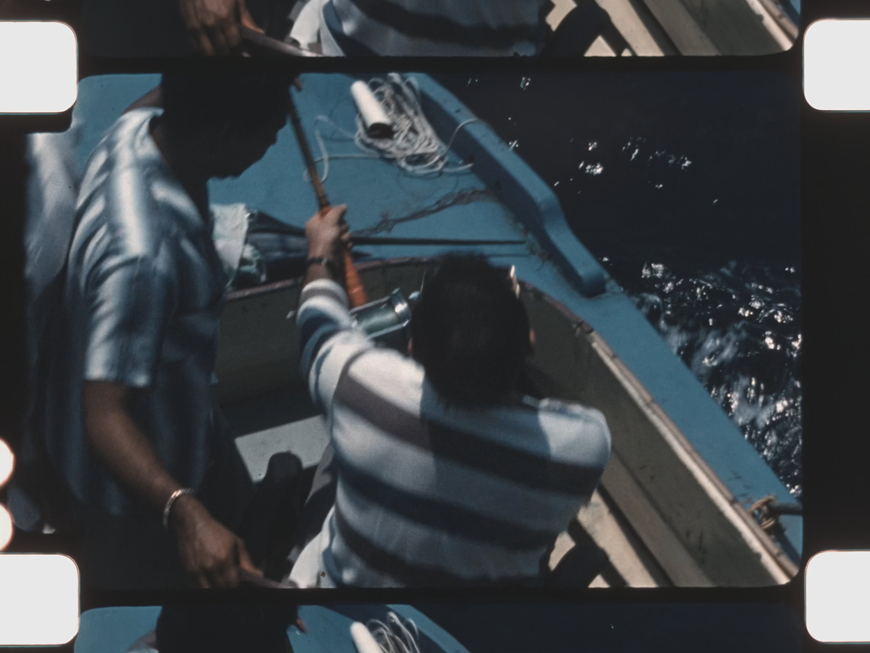 A fishing excursion follows offshore, where men work together from a boat to land a saltwater fish. The struggle and eventual success are shown in extended detail, culminating in the fisherman holding up the catch—an understated moment of triumph typical of travel and sport fishing footage.