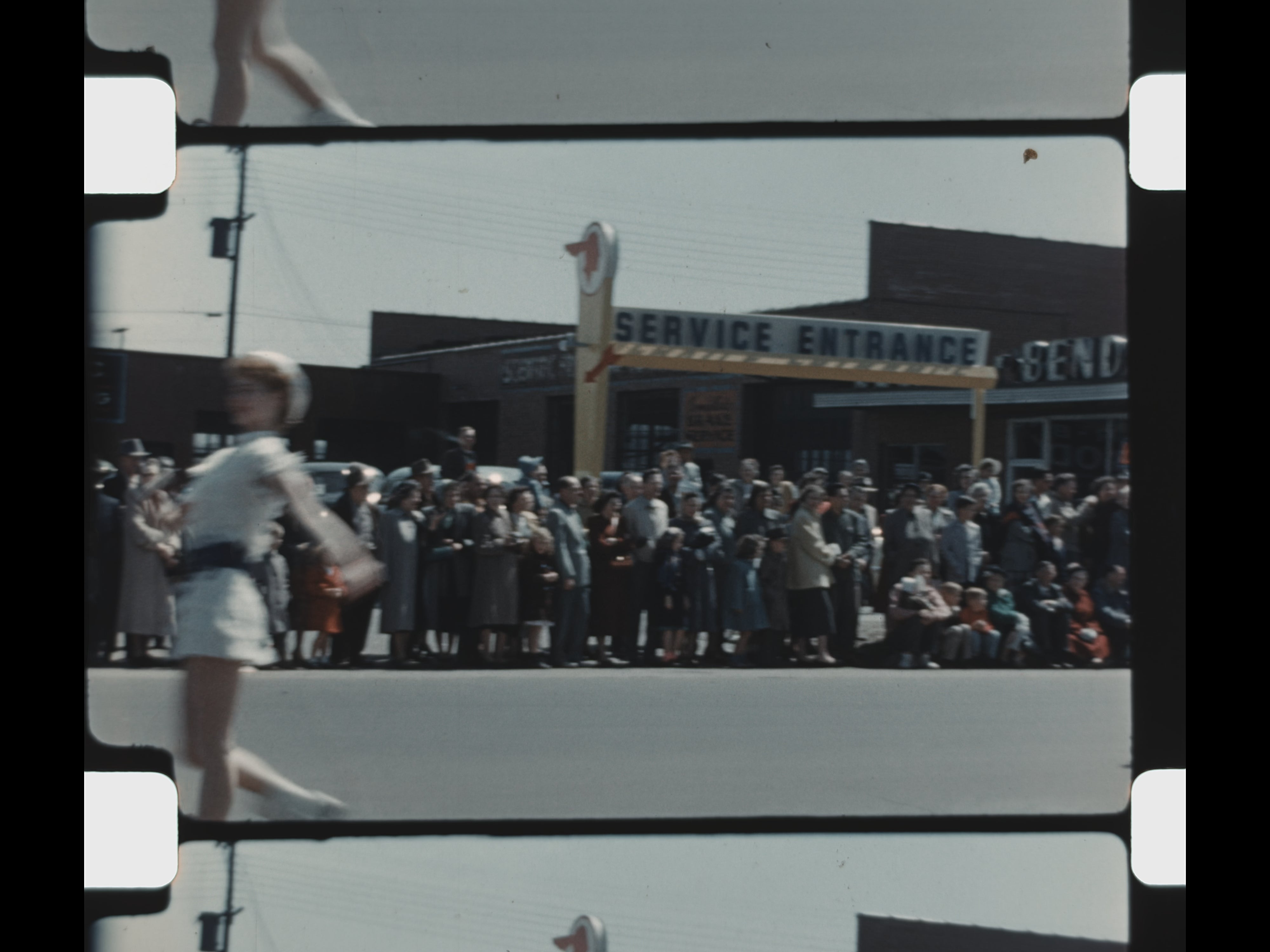Community life comes into focus with footage from a local parade passing in front of the Becker-Bender Pontiac Body Shop. A marching band proceeds down the street, followed by decorated floats, including one from the Benton Harbor Chamber of Commerce. Throughout the reel, family members are seen holding and caring for a baby, Including a black woman caring for a white baby.