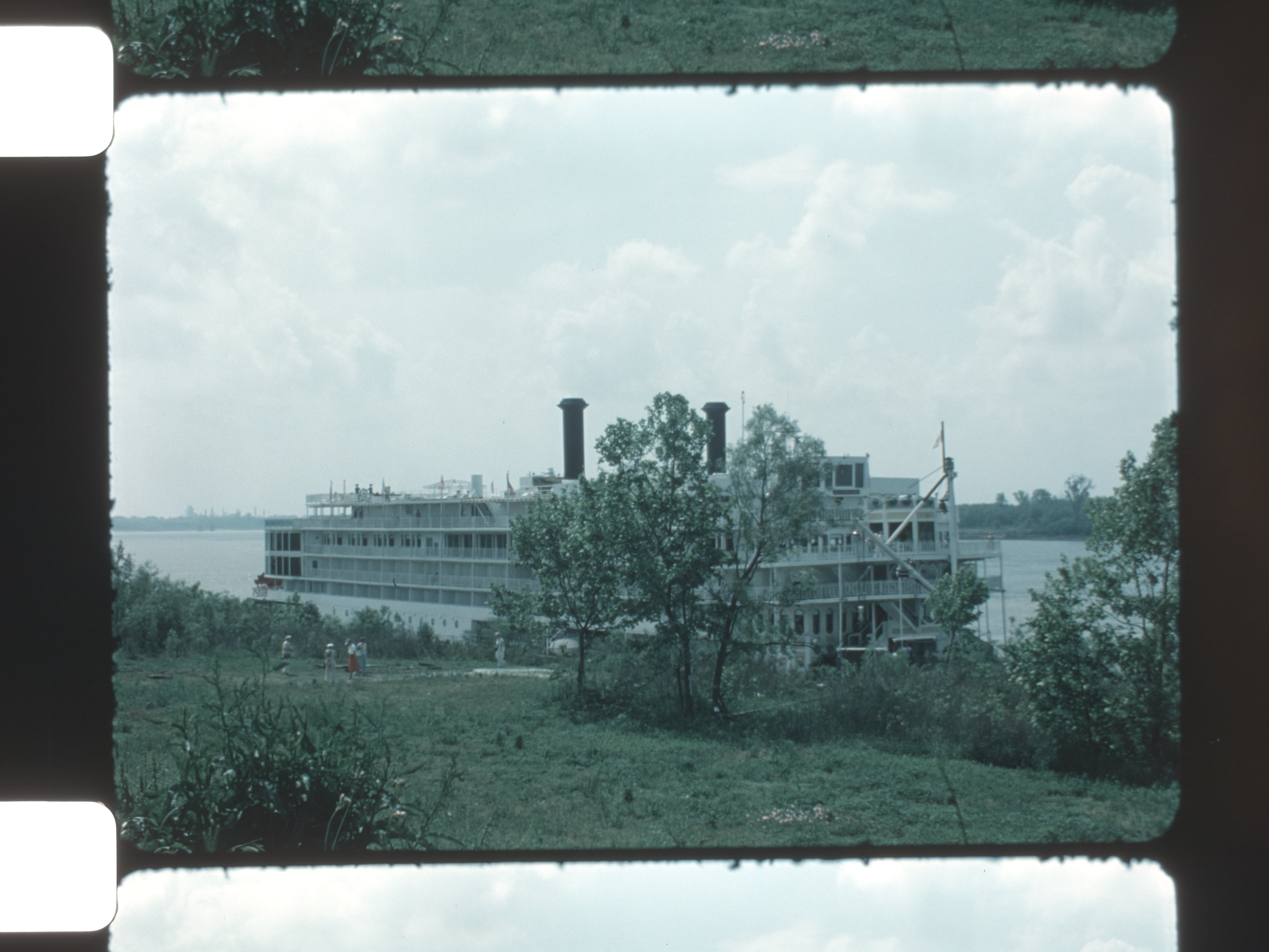 Mississippi River, River cruise, Mississippi Queen, Steamboat travel, Beach, Beachgoers, American flag, Boating, Bridge crossing, Plantations, Antebellum mansion, Oakley House, Historic homes, Vicksburg Mississippi, Civil War history, Vicksburg National Military Park, Battlefields, Monuments, Port of Vicksburg, River commerce, Southern travel, Midcentury tourism, Historic preservation, 16mm film, Color home movies, Americana, Analog film, Nostalgic footage