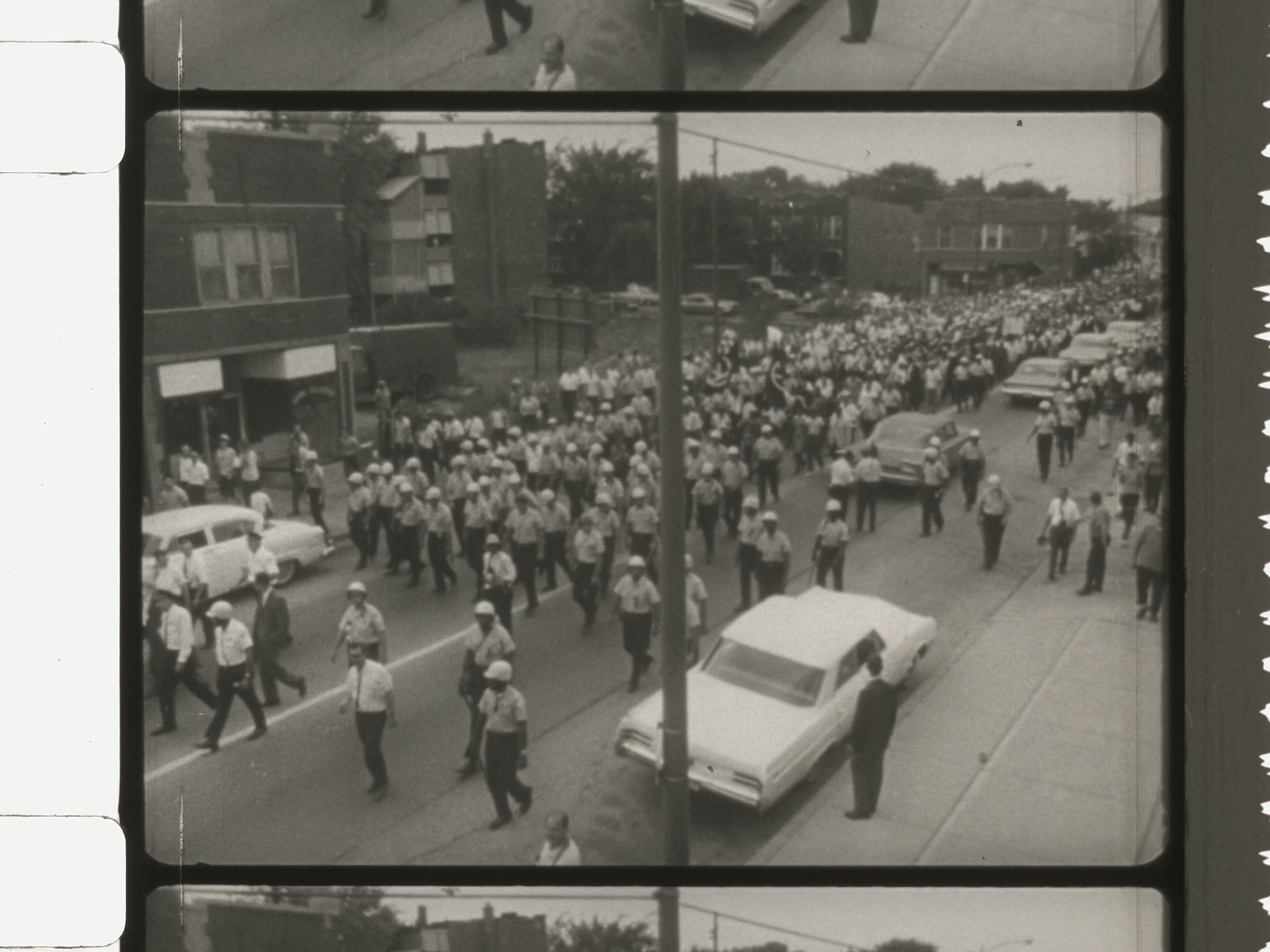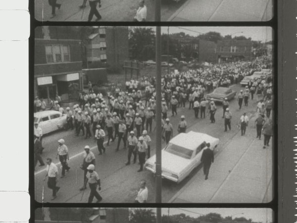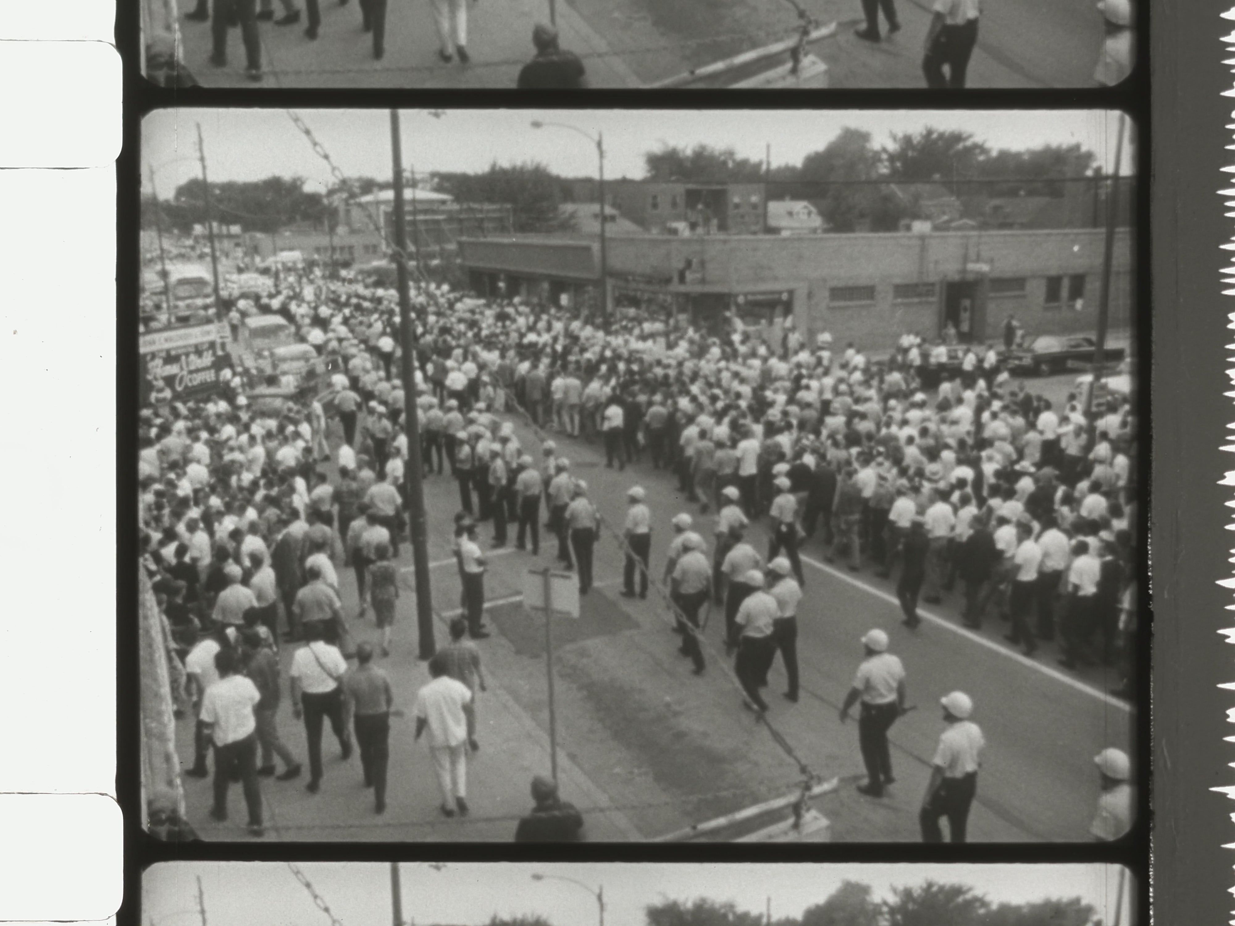 This intense black-and-white sound reel continues the documentation of Martin Luther King Jr.’s Chicago campaign, capturing the escalating confrontation between nonviolent civil rights demonstrators and hostile white opposition. The footage presents some of the most volatile moments of the Chicago marches, revealing the depth of resistance King encountered in the North.