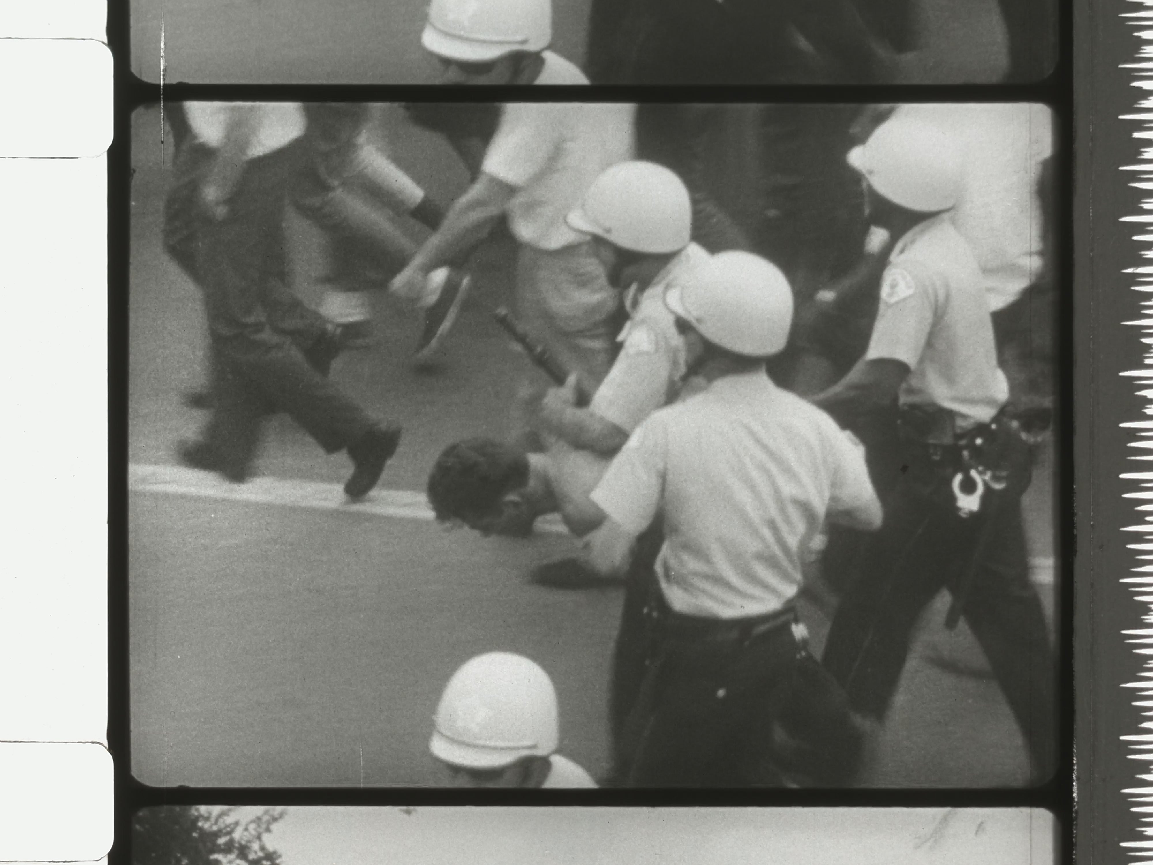 The reel opens as the march through Chicago continues. White counter-protesters grow increasingly aggressive—shouting slurs, displaying white-power imagery and Nazi flags, and overturning cars in the streets. Chicago police line entire blocks in large numbers, attempting to contain the violence and arresting agitators as tensions spill into chaos.