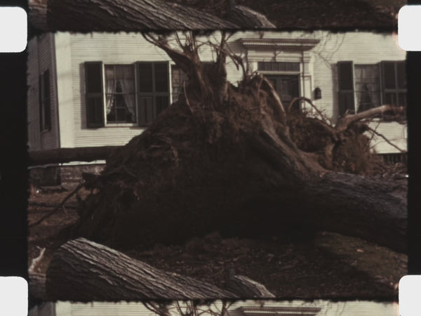 The tone shifts dramatically as the film documents the aftermath of the 1938 New England Hurricane, one of the most destructive storms in U.S. history. High winds have uprooted massive trees, which lie scattered across neighborhoods and streets. Entire sections of town show widespread damage: houses and businesses are visibly affected, debris litters the ground, and residents work together to clear fallen trees and wreckage.