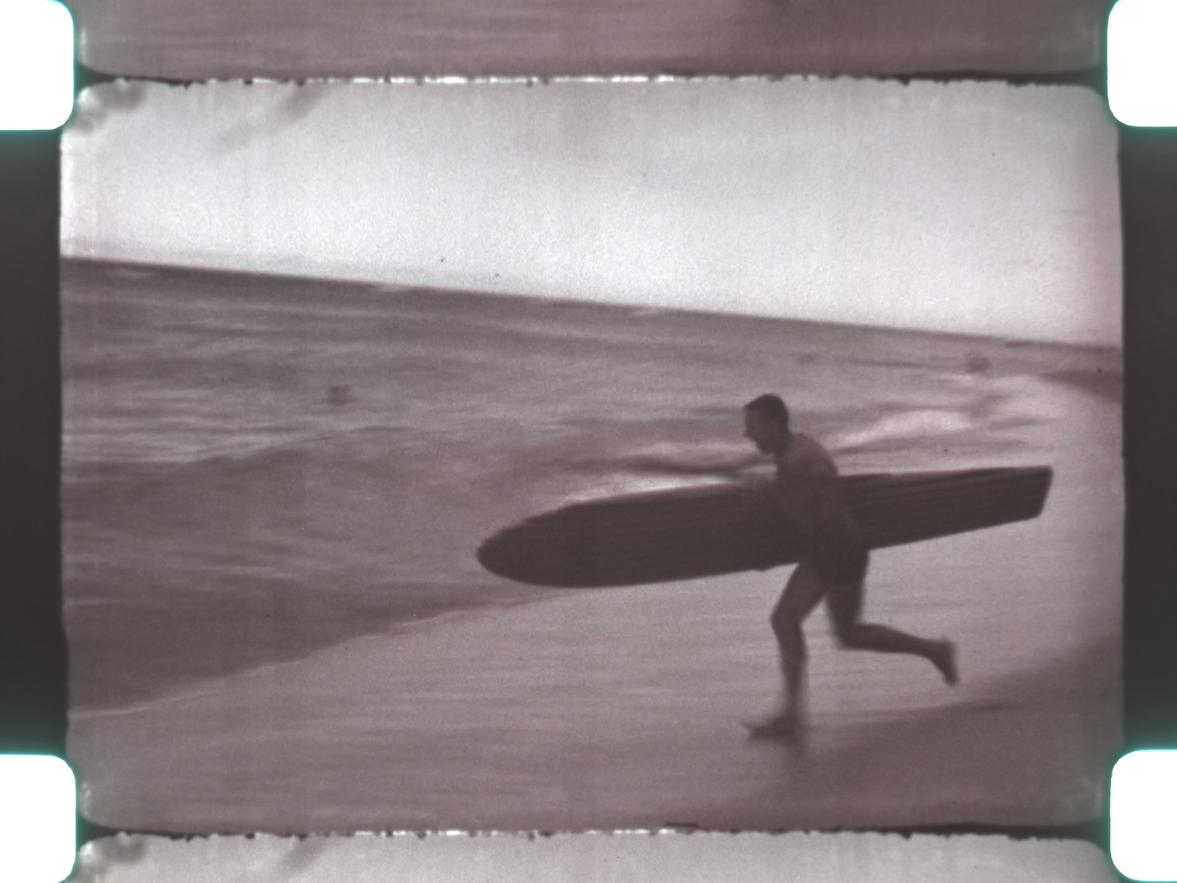 A waterfall sequence provides a lush inland contrast to the coastal imagery. Particularly notable are scenes of early surfing, featuring a man riding waves on a long surfboard, documenting surf culture decades before its global popularization.