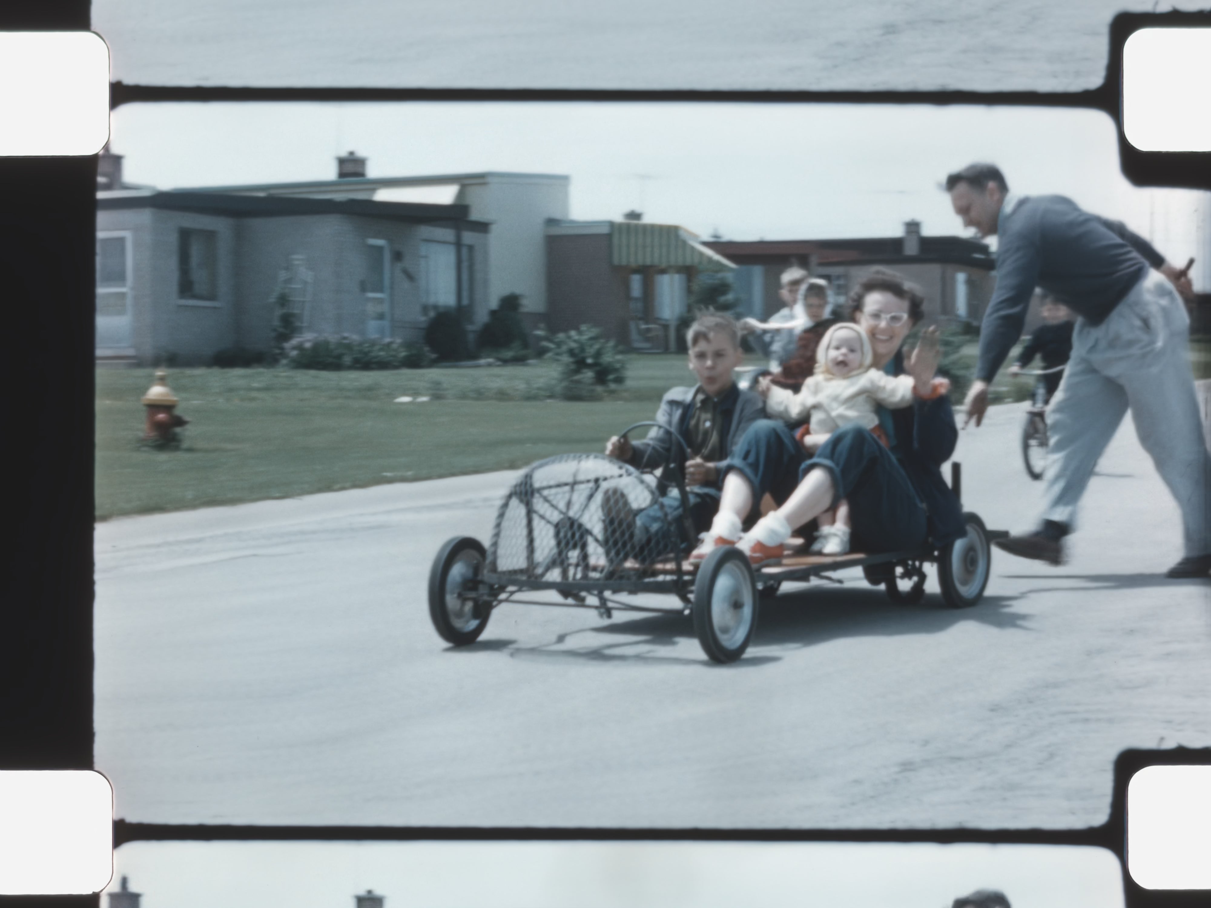 Neighborhood life appears next, with families driving go-karts along residential streets, emphasizing the playful, community-oriented use of suburban spaces. Exterior shots reveal Mid Century Modern houses and a planned neighborhood layout, visually anchoring the footage in the architectural style of the era.
