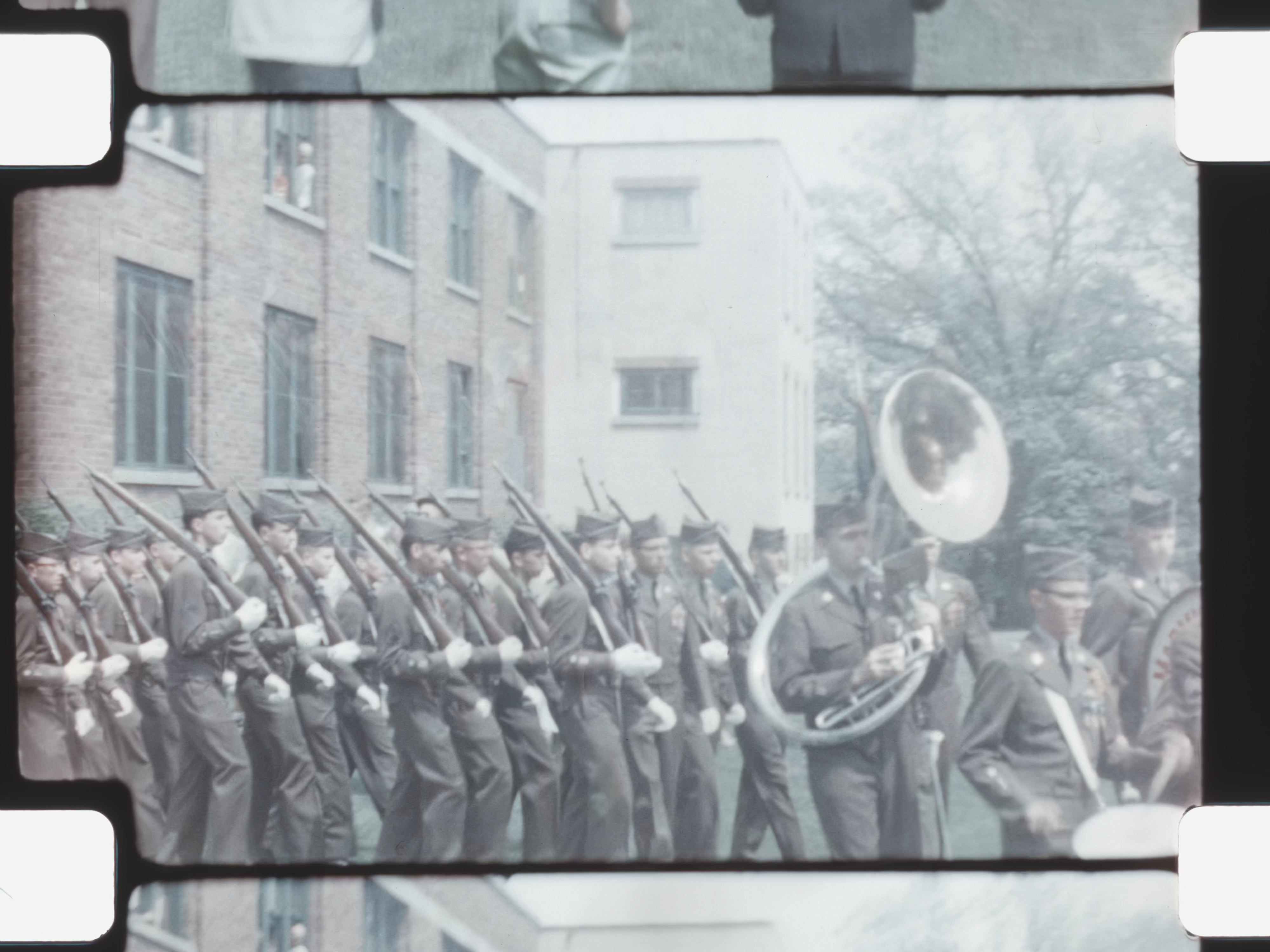 The reel concludes with a public event of a more formal nature. People attend a military gathering featuring a marching band, capturing uniforms, ceremony, and civic pride. This closing sequence contrasts the earlier domestic and social scenes, rounding out the film with a broader view of community life in 1954.