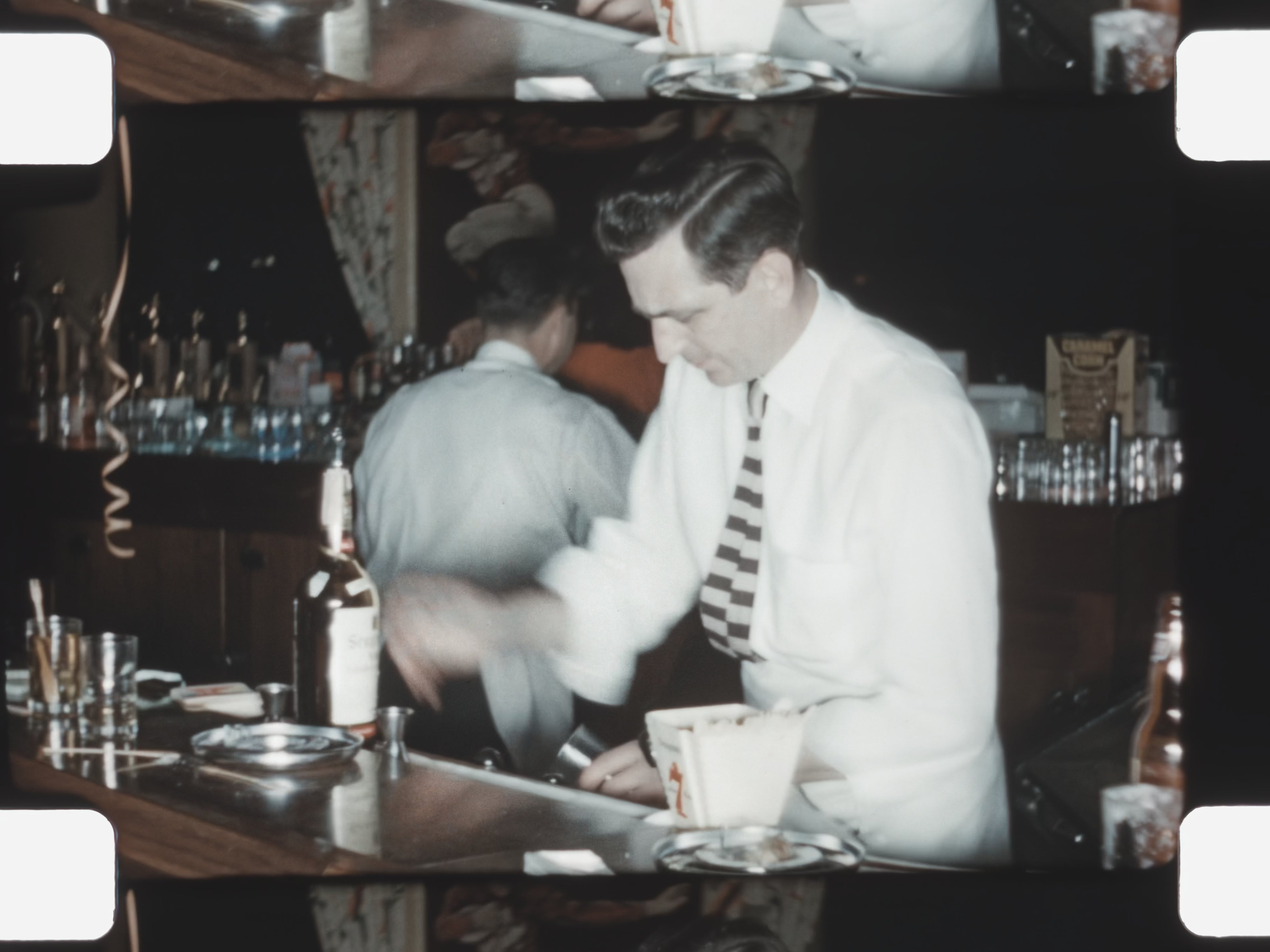 The film opens at a party where adults dance freely, filling the frame with movement and energy. Scenes from a large Christmas party held at a diner follow, showing guests socializing and celebrating together. A bartender prepares drinks as people dance behind the bar, reflecting the informal, convivial atmosphere of midcentury holiday gatherings.